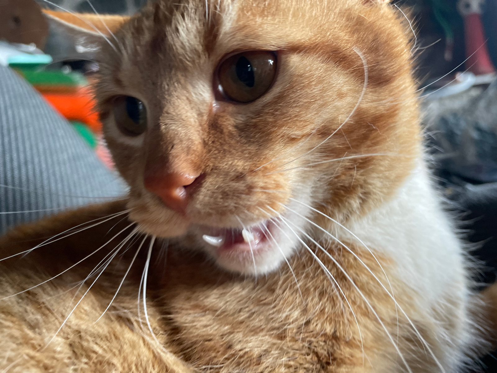A close-up shot shows the face of an orange tabby cat with white markings. The cat's brown eyes are focused forward, and its mouth is slightly open, revealing its teeth. Long, white whiskers extend fr…read more
