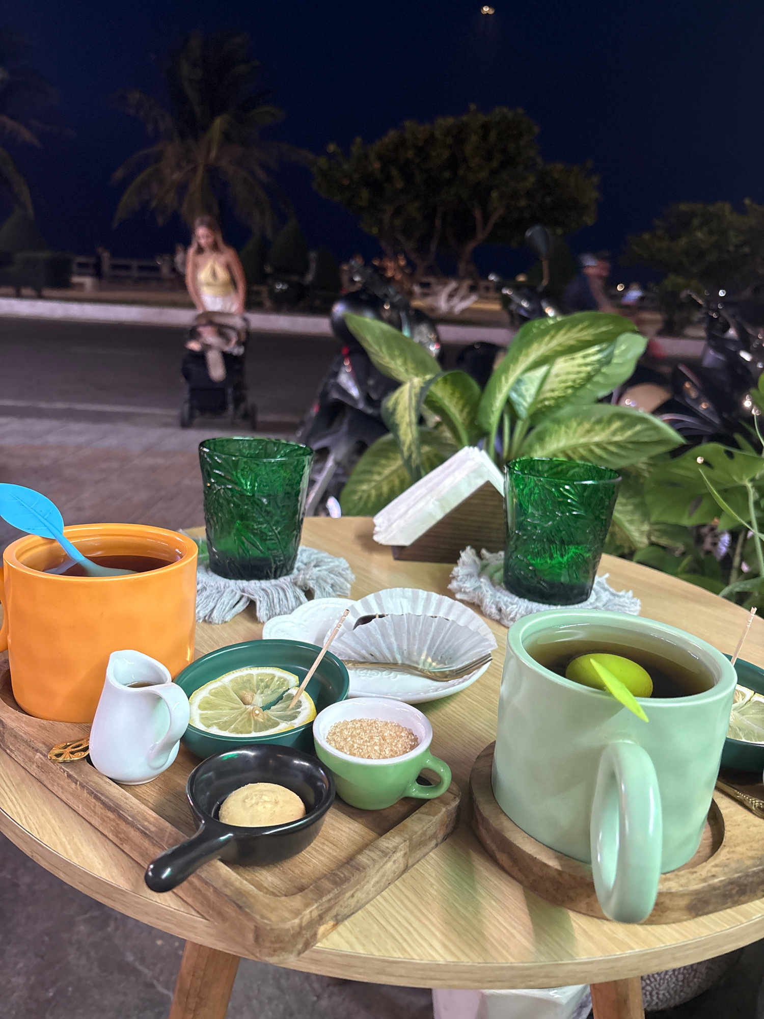 On a wooden table outdoors, presumably in Bắc Nha Trang, Vietnam, given the presence of tropical flora and a dimly lit cityscape in the background, an assortment of tea-related items is arranged. Ther…read more