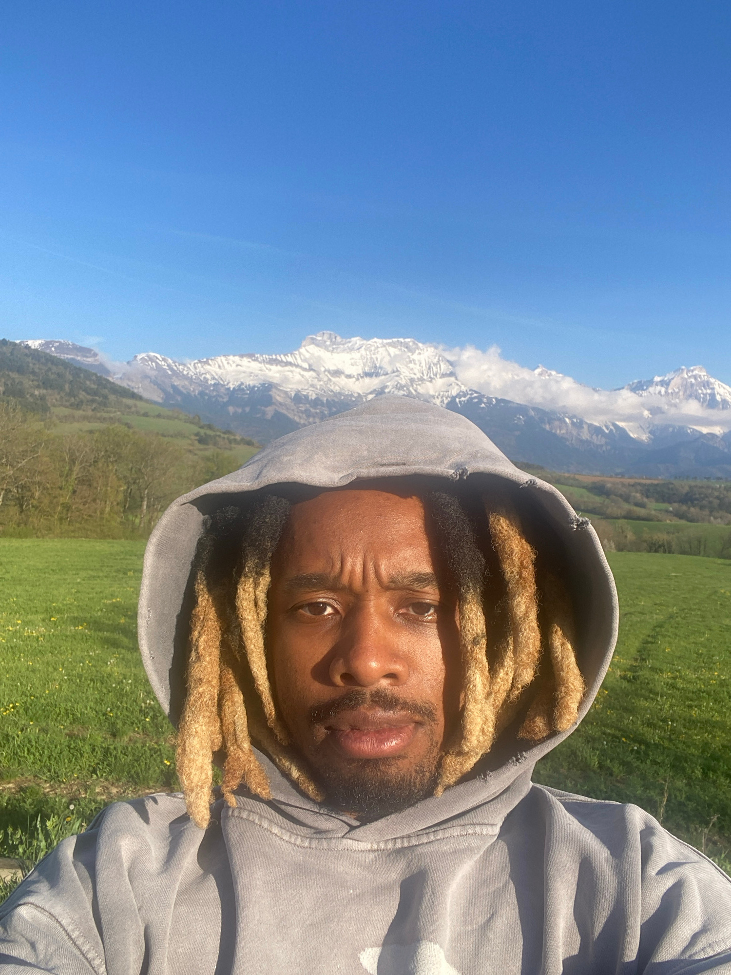 A selfie shows a man with blonde dreadlocks wearing a gray hoodie, set against a background of mountains and a green field. The mountains are snowy, possibly indicating high altitude. The sky is clear…read more