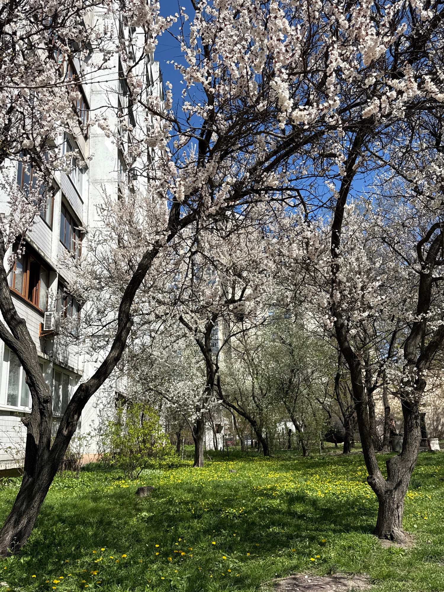 A spring day in Kyiv, Ukraine. Trees in full bloom line a green space with yellow wildflowers. A multi-story building with angular windows is visible behind the blooming trees. The sky is blue. There…read more