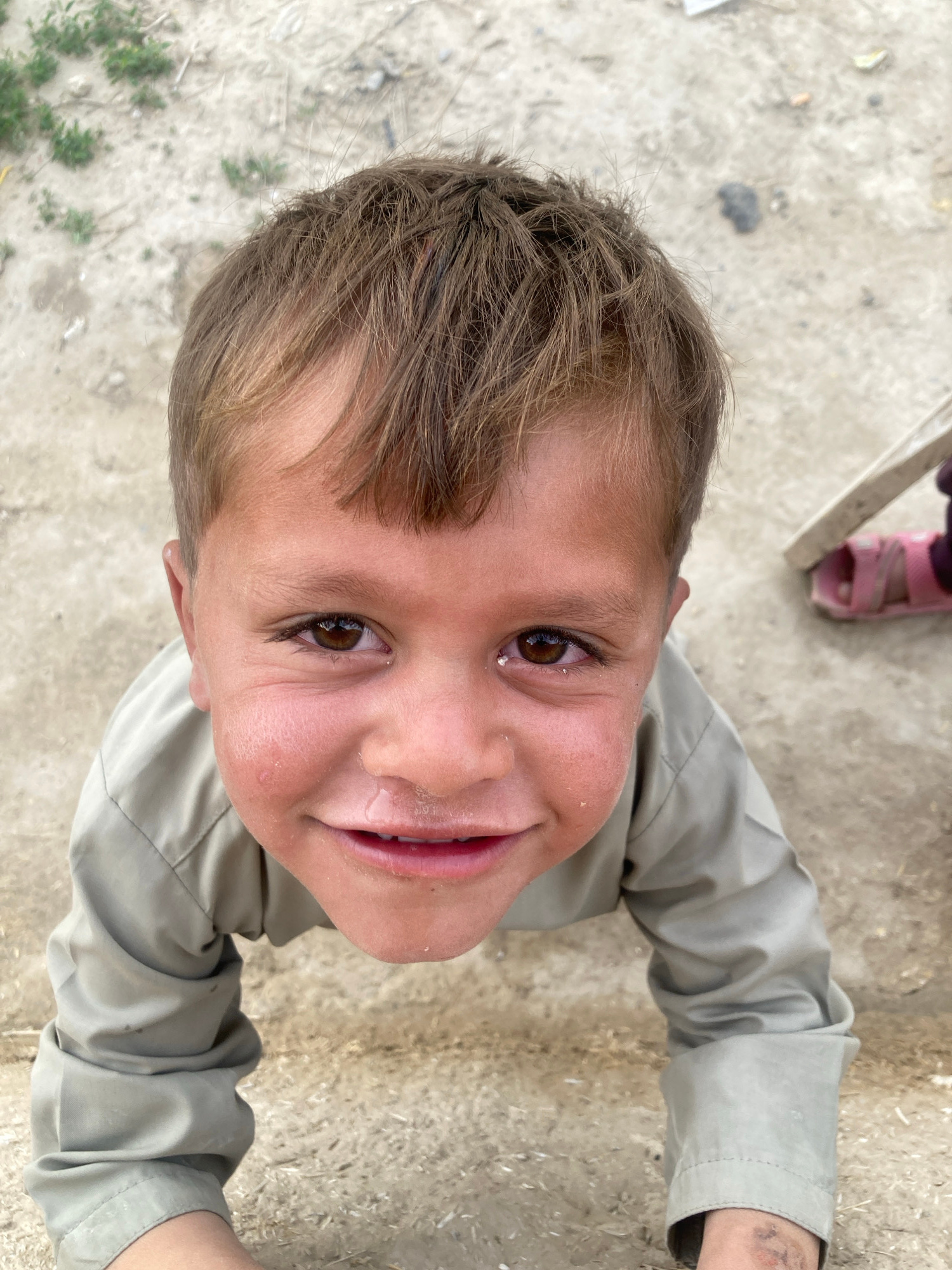 A close-up, high-angle portrait shot depicts a young child, approximately 3-6 years old, situated outdoors on dusty, light-brown ground with sparse green vegetation, within the geographical context of…read more