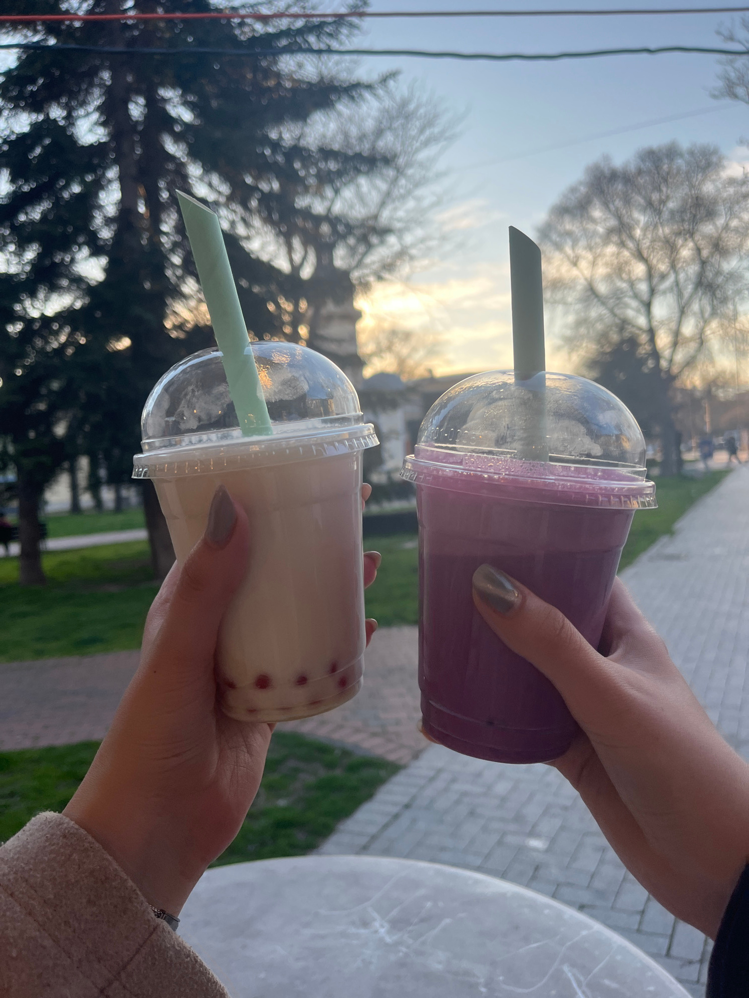 Two hands hold two boba teas, one purple and one white. Both drinks have green straws. The drinks appear to be outside, near a city environment. There are trees in the background and what may be a strβ¦read more