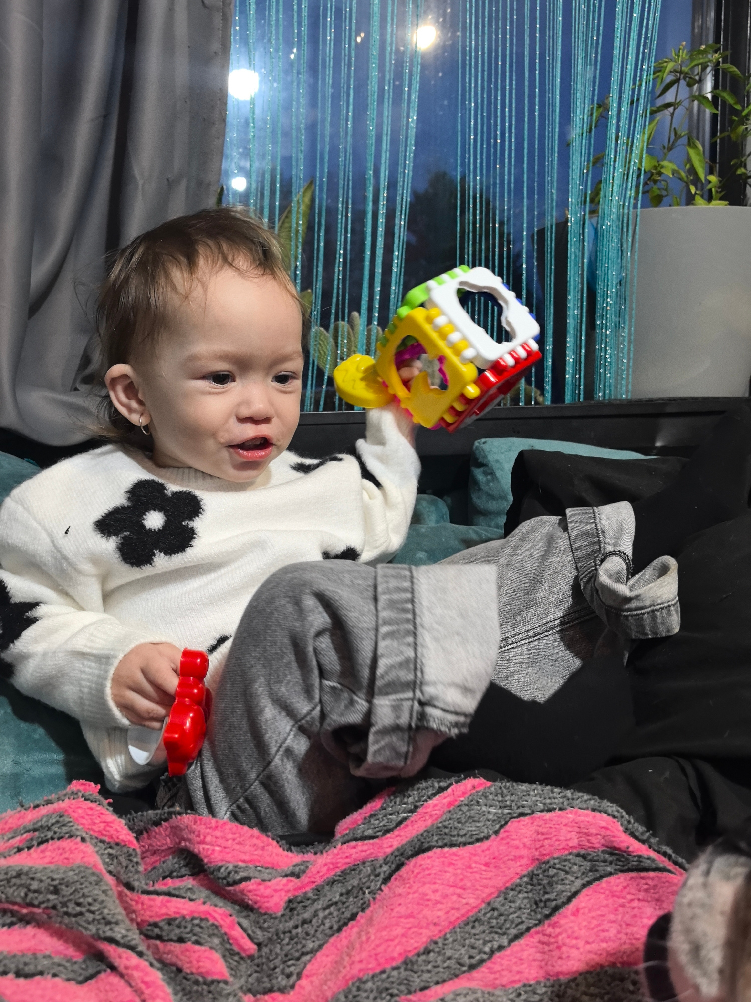 In the city of Noviy, Russia, a young child, approximately one to two years old, is seated indoors on a teal-colored upholstered surface, likely a sofa or armchair. The child has light brown hair and…read more