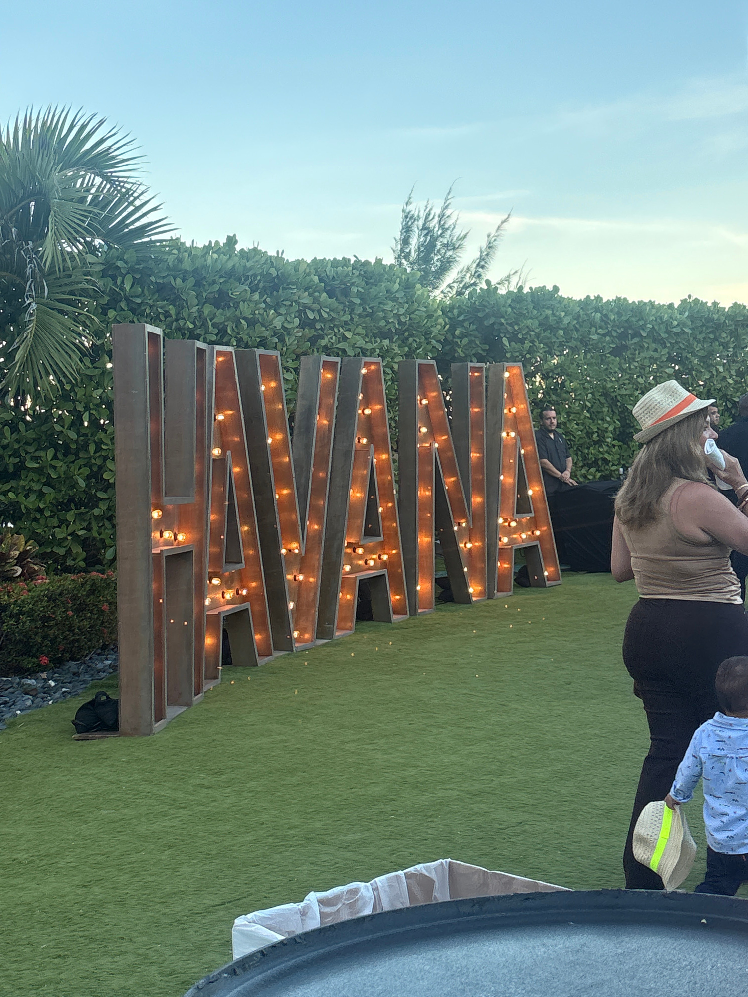Captured at an outdoor event in Miami Beach, United States of America, the image presents a scene on artificial green turf, flanked by meticulously manicured hedges. A large, illuminated "AWAKEN" sign…read more