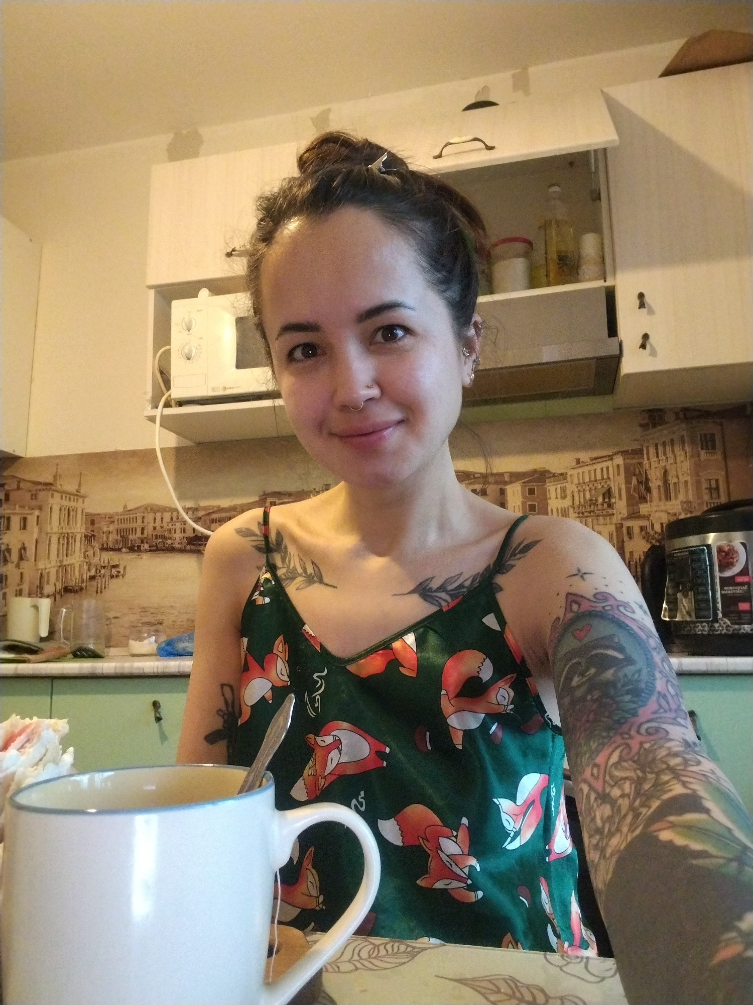A young woman is captured in a close-up, chest-up selfie or portrait, smiling softly directly at the camera. She appears to be in a kitchen setting in Noviy, Russia, indicated by the background and vi…read more