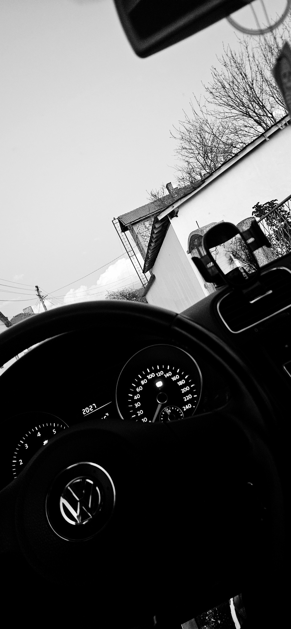 The image, taken from inside a vehicle, shows a partial view of the steering wheel and dashboard. The speedometer indicates a reading around 80 km/h. The car's interior lighting illuminates the dashbo…read more