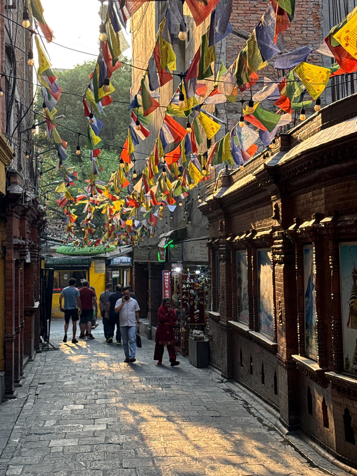 The image captures a narrow street scene in Kathmandu Metropolitan City, Nepal. Prayer flags are strung across the street. People are walking along the paved street. Buildings line both sides, with sh…read more