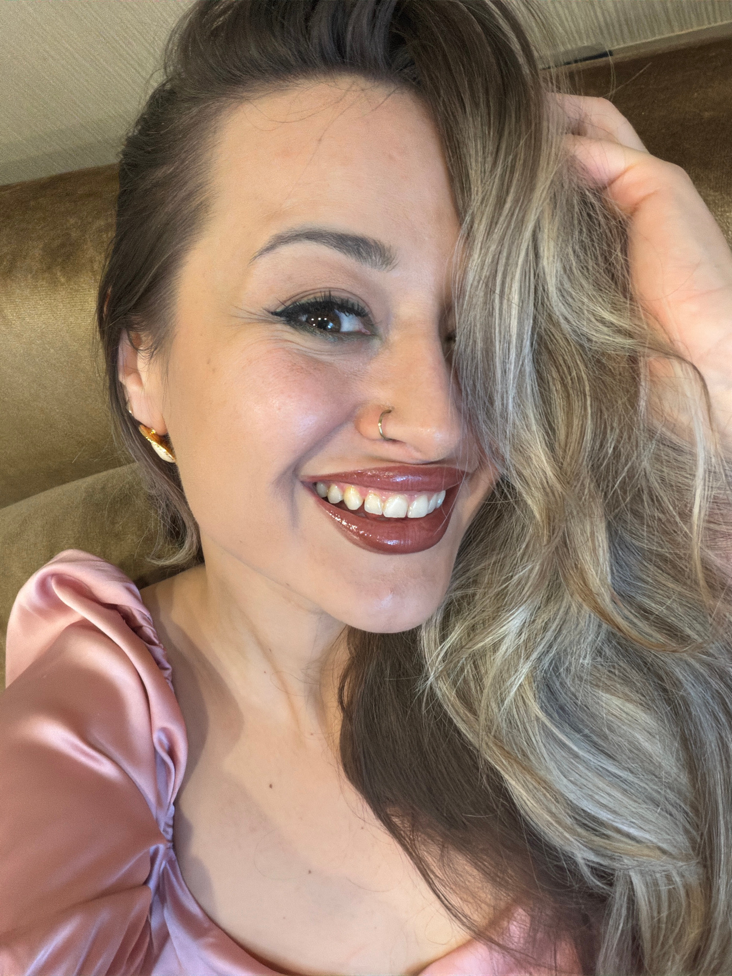 A woman lies on what appears to be a brown upholstered surface, possibly a couch or a bed. She is wearing a pink satin top. Her hair is light brown with blonde highlights, styled in waves, and her rig…read more