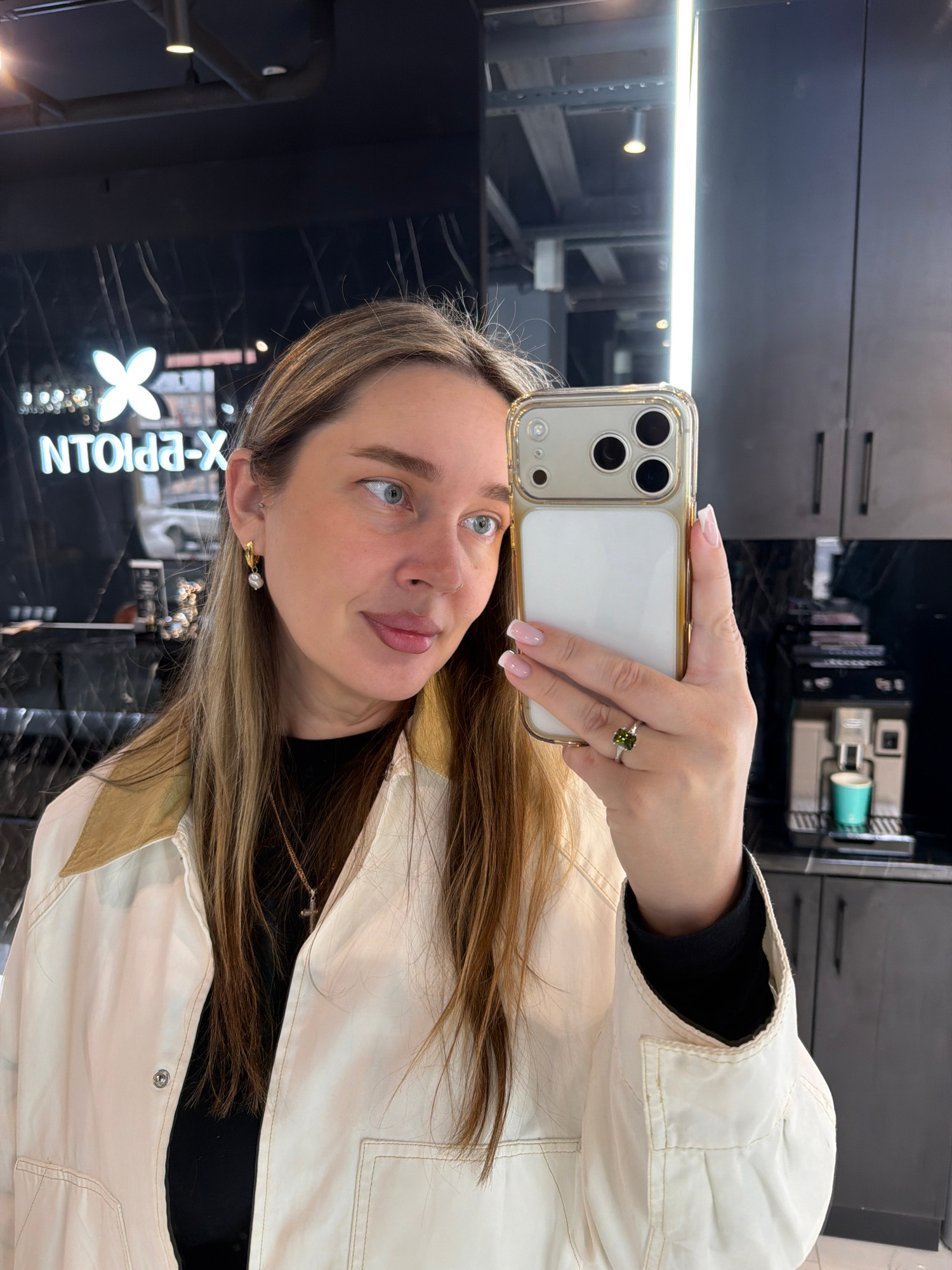 A young woman is depicted taking a selfie in what appears to be a mirror or reflective surface in an indoor setting. She is oriented with her head slightly tilted and her gaze directed upwards and toβ¦read more