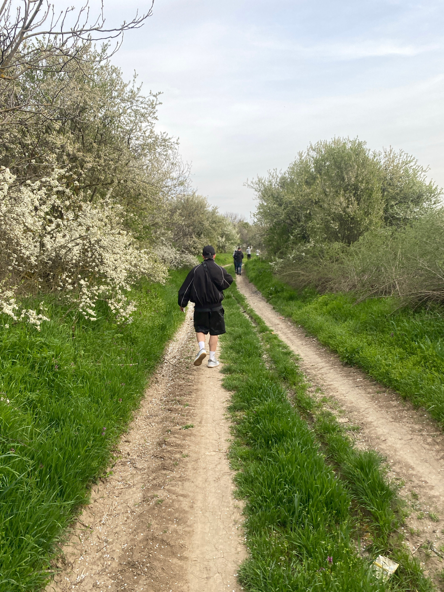 A dirt path cuts through a grassy field, flanked by trees and flowering bushes. Two figures are walking along the path. The person in the foreground is wearing a dark jacket, shorts, and white shoes.…read more