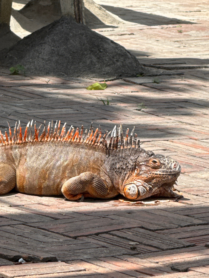 A reddish-brown iguana, featuring prominent orange and white dorsal crest spikes and an orange-tinged dewlap, rests horizontally on a reddish-brown brick-paved surface. The iguana's head is slightly eā¦read more