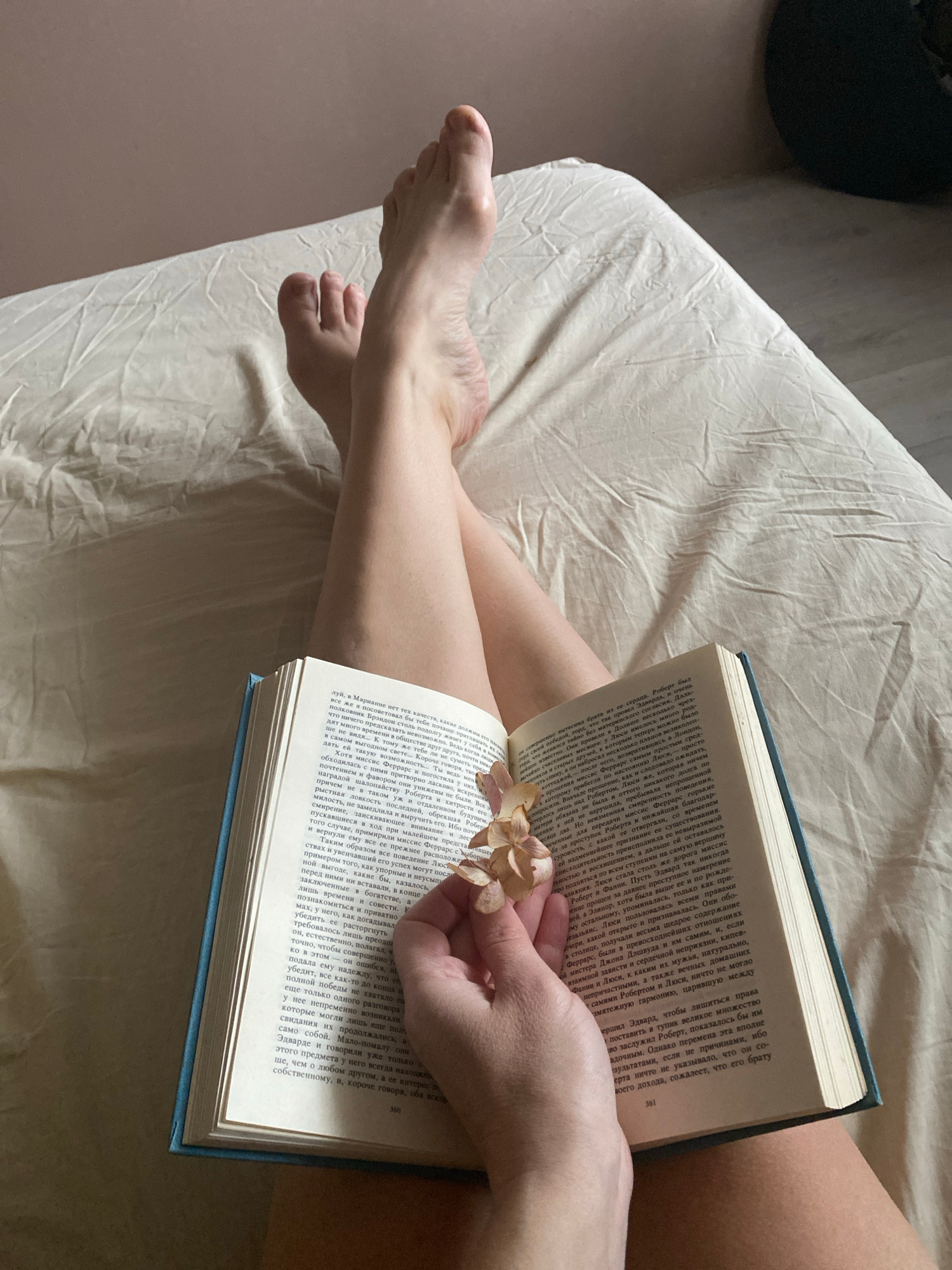 The image shows a close-up of a person lying in bed with an open book. The book is held open with one hand, with a dried flower placed in the middle of the pages. The person's legs and feet are visibl…read more