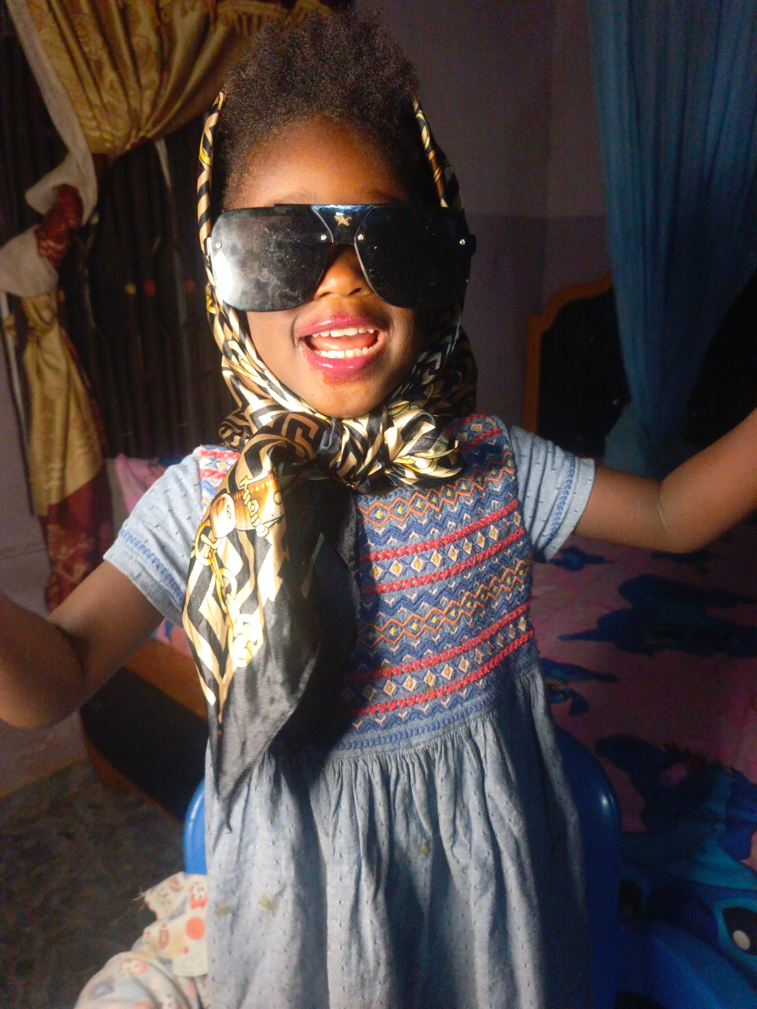 A young child stands indoors in Akwanga, Nigeria. The child wears a light blue dress with geometric embroidery on the upper part, oversized black sunglasses, and a patterned scarf tied around their heβ¦read more