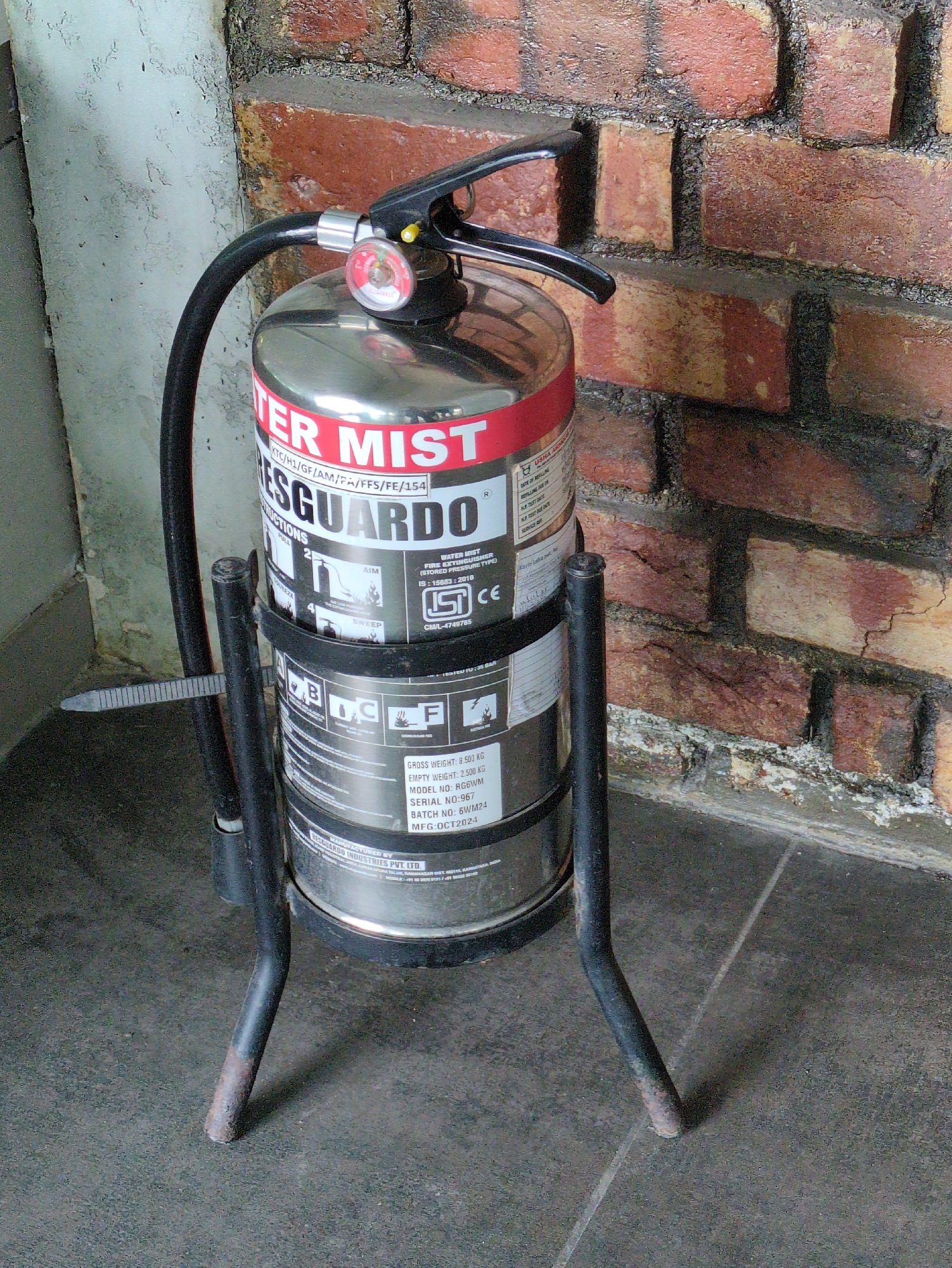A water mist fire extinguisher, lying horizontally on a black metal stand, rests against a brick wall and a gray concrete floor. The extinguisher has a red band labeled "WATER MIST ESGUARDO" and detai…read more