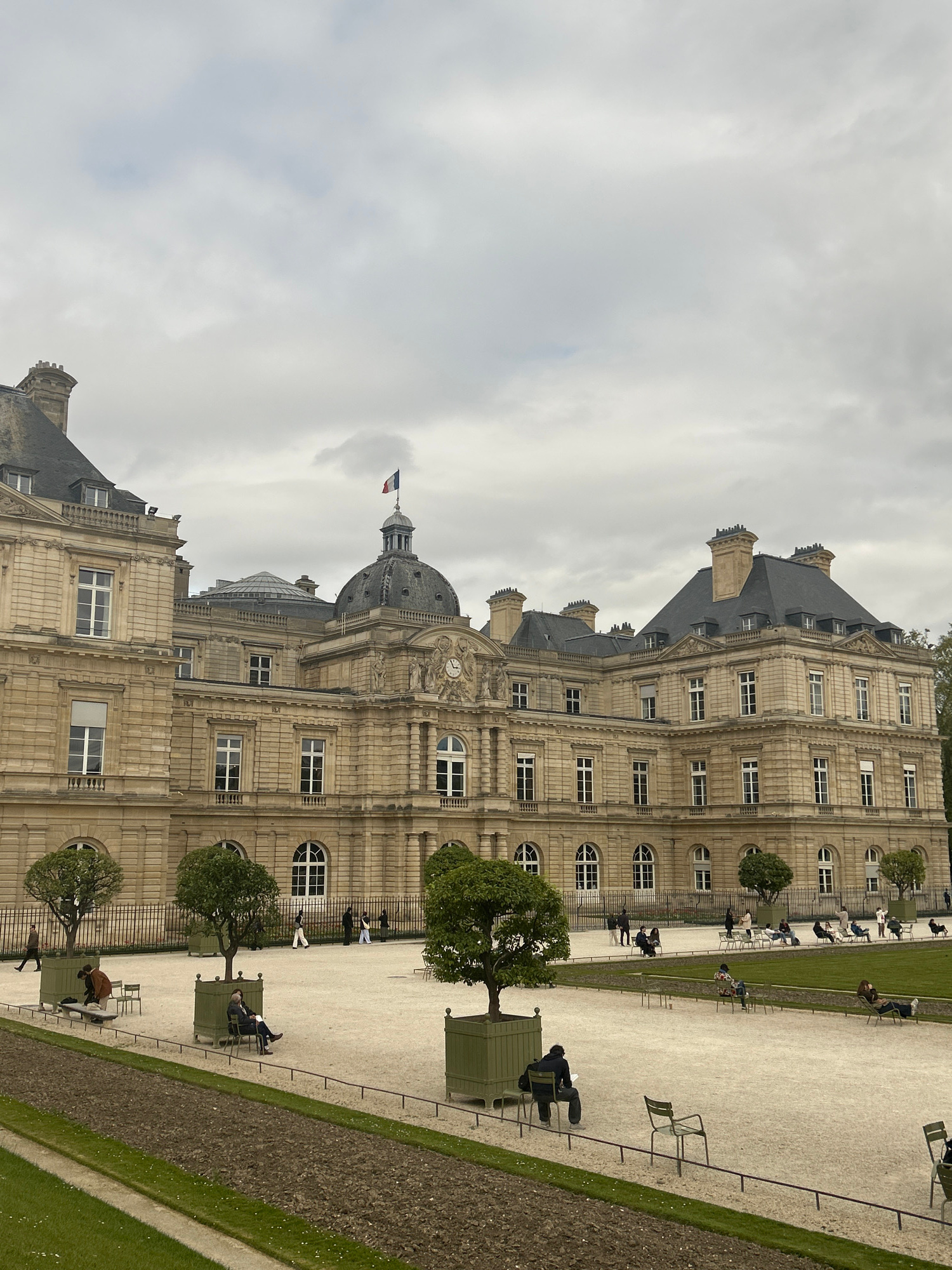 The image depicts the Palais du Luxembourg in Paris, France, under an overcast sky. The palace is a large, multi-story building constructed of light-colored stone with numerous arched windows. A promi…read more