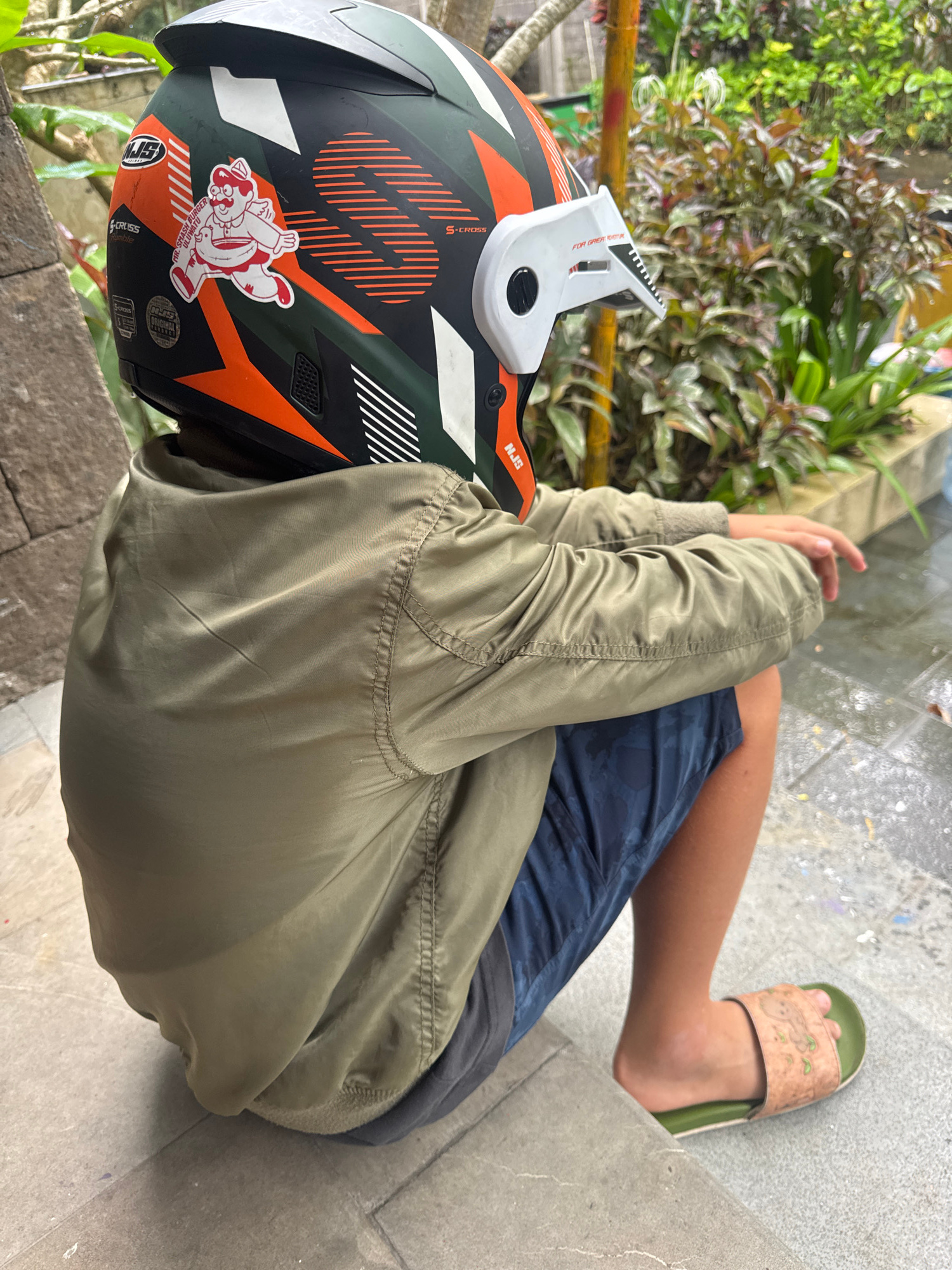 A young individual wearing a military-style green bomber jacket, blue shorts, and a single green sandal is seated near some greenery and a tiled surface, seemingly outdoors. A multi-colored helmet wit…read more