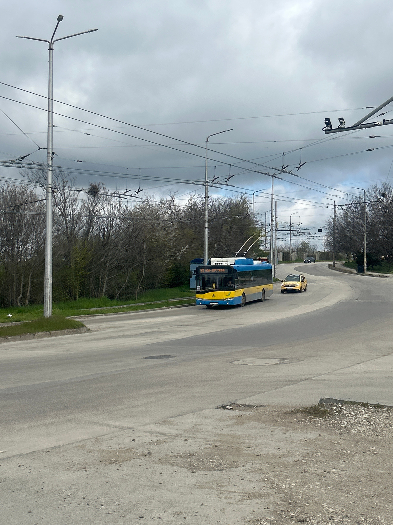 The image shows a street in Pleven, Bulgaria. A blue and yellow trolleybus is traveling on the right side of the road. A yellow car follows behind it. Overhead wires for the trolleybus are visible. Ba…read more