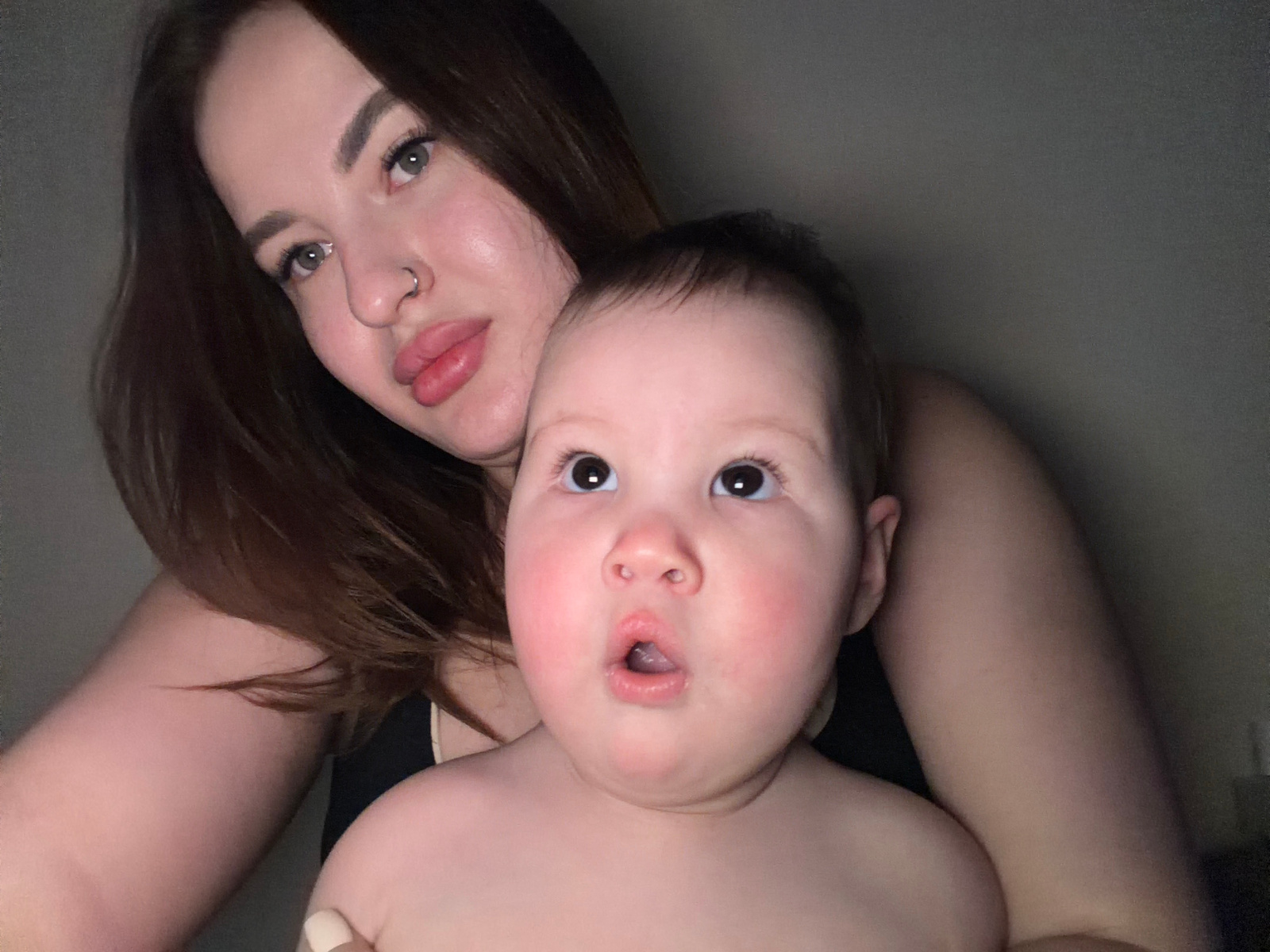 The image depicts an adult female and a baby. The baby is positioned above the female, with its face visible. The adult female's face is visible, with her cheek touching the baby's head. The baby has…read more