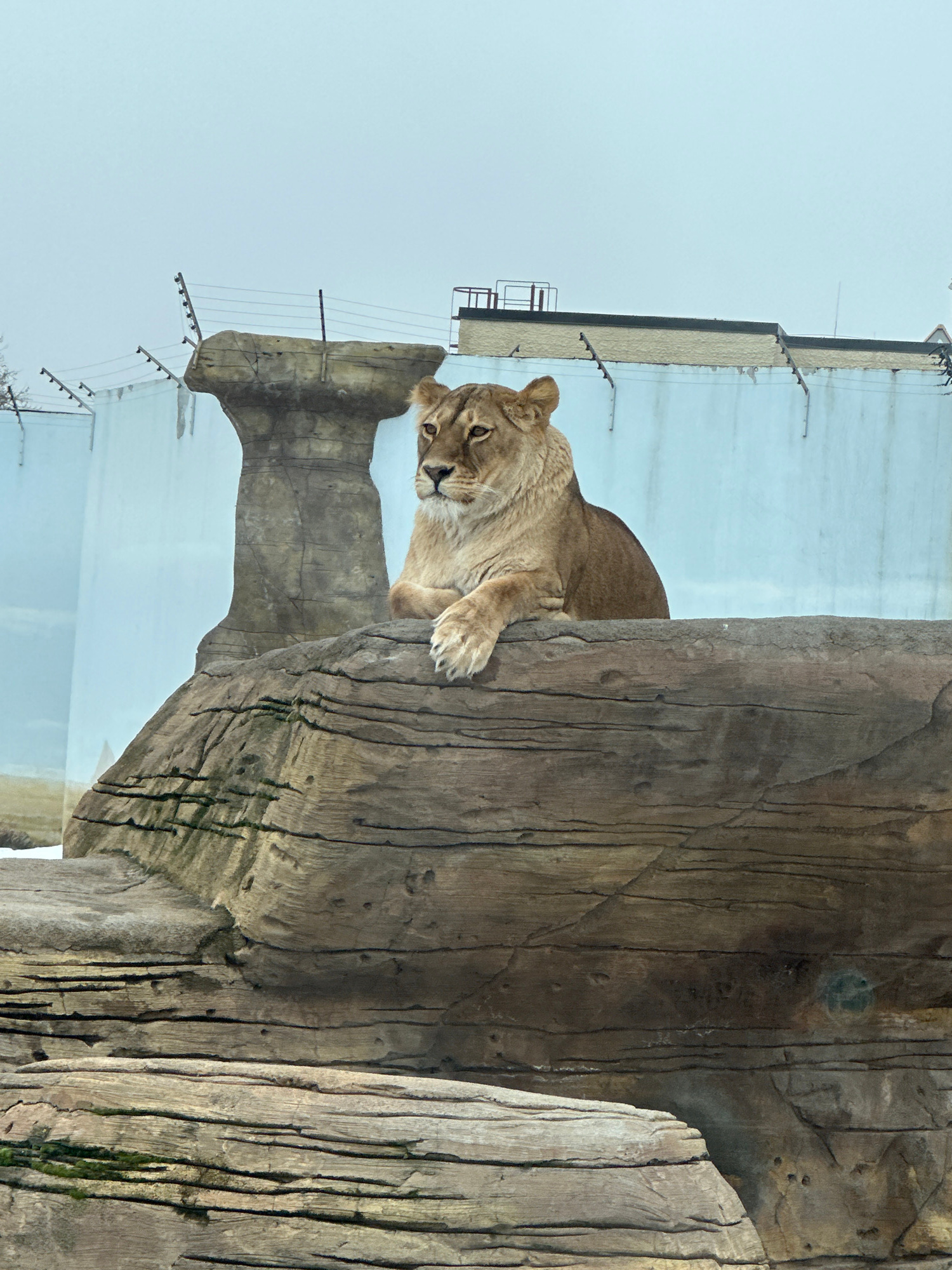 A medium shot depicts a lioness resting on a rocky, elevated platform, with an out-of-focus building and overcast sky in the background. The lioness is light brown, with her paws visible as she rests…read more