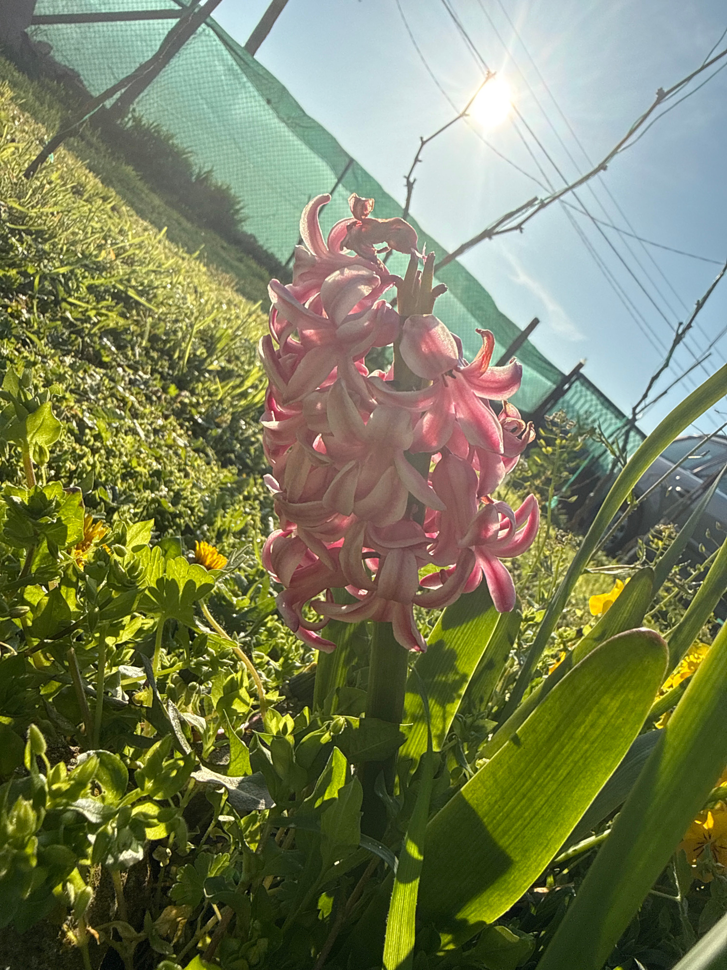 The image shows a cluster of pink hyacinth flowers in a garden setting, likely in Zornitsa, Bulgaria. The flowers are in full bloom and dominate the foreground. Behind the hyacinths, there is dense gr…read more