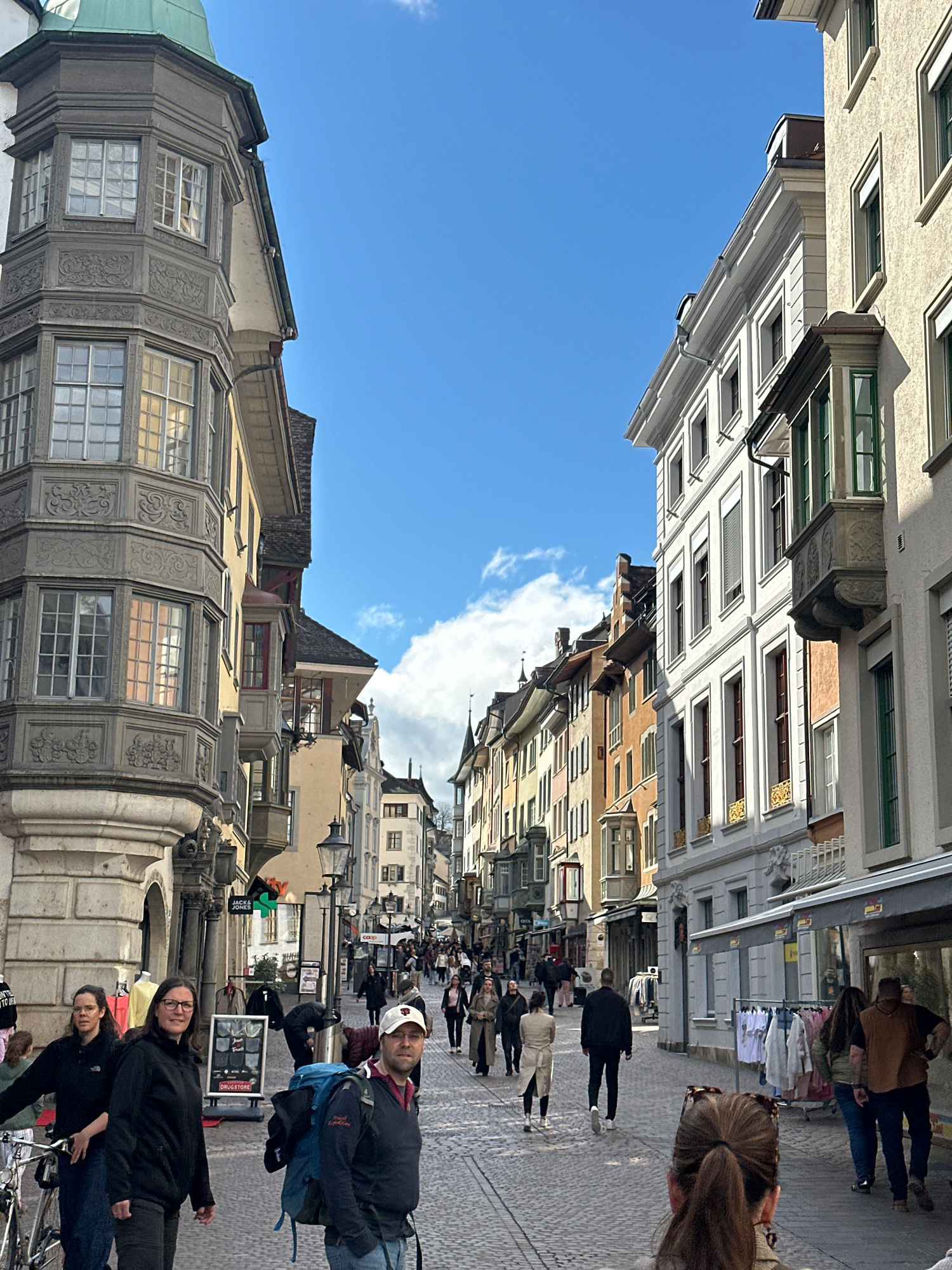 The image depicts a street scene in Schaffhausen, Switzerland, characterized by narrow cobblestone streets lined with historic buildings. The buildings showcase a mix of architectural styles with orna…read more