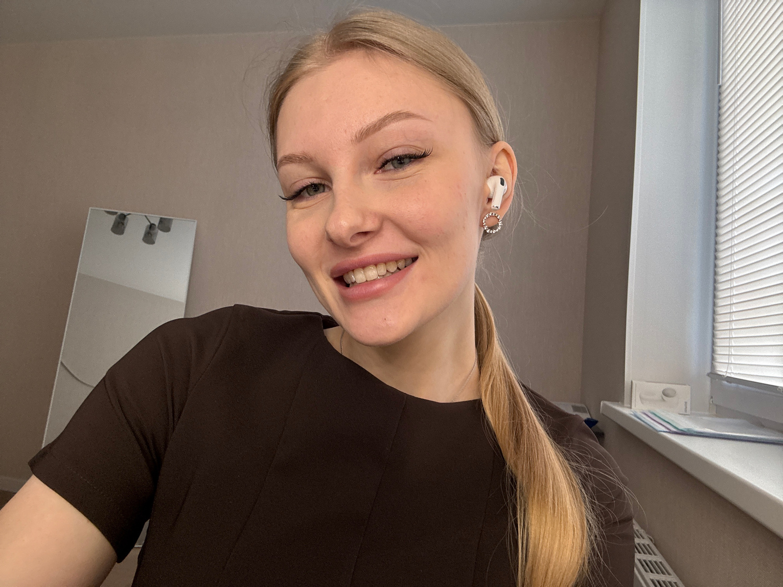 The image is an upside-down selfie of a fair-skinned woman with blonde hair, wearing a brown dress and an earring. She is smiling, and an AirPod is visible in her ear. In the background, there's a win…read more