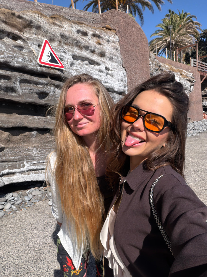 Two women pose for a selfie outside. One woman has brown hair and is wearing orange-tinted sunglasses and a brown jacket. She's sticking out her tongue. The other woman has long blonde hair and is wea…read more
