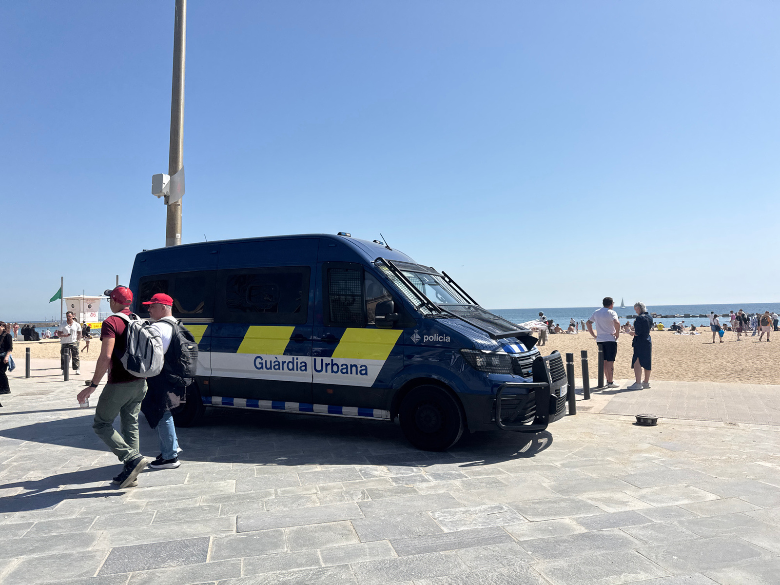 The image shows a blue "Guardia Urbana" (Barcelona's city police) van parked on a paved area adjacent to a beach in Barcelona, Spain. Two men, both wearing red baseball caps and backpacks, are walking…read more