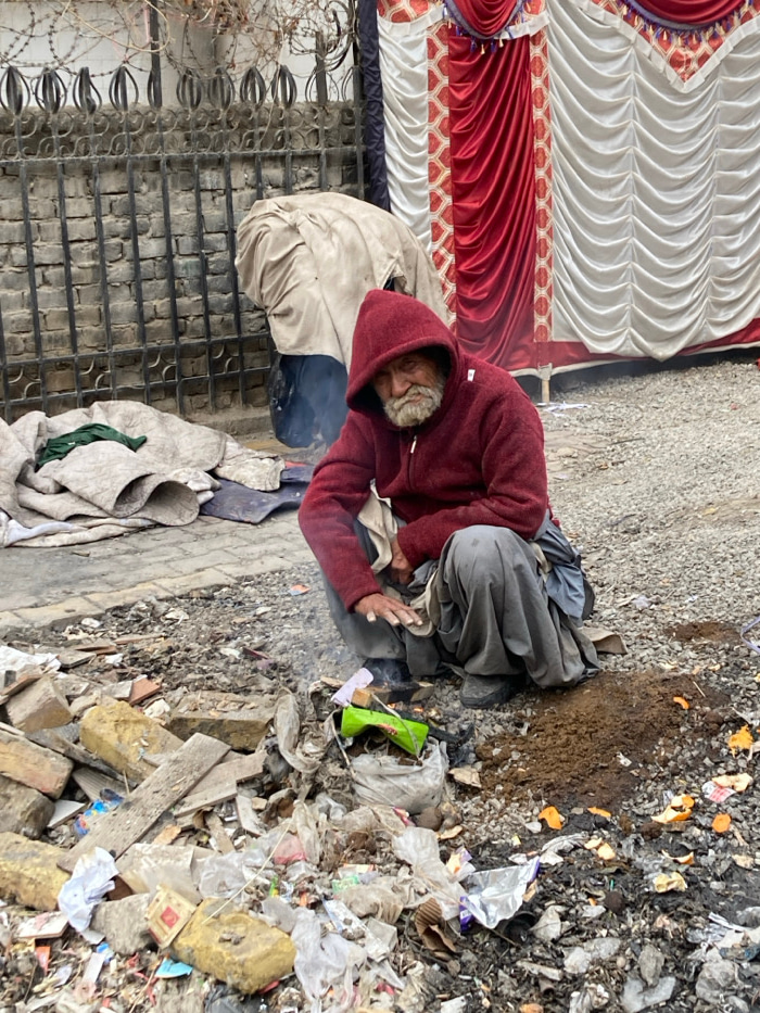 An elderly male with a white beard and mustache, wearing a red hooded fleece jacket and grey trousers, squats on a debris-strewn ground in Quetta City Tehsil, Pakistan. He warms his hands over a small…read more