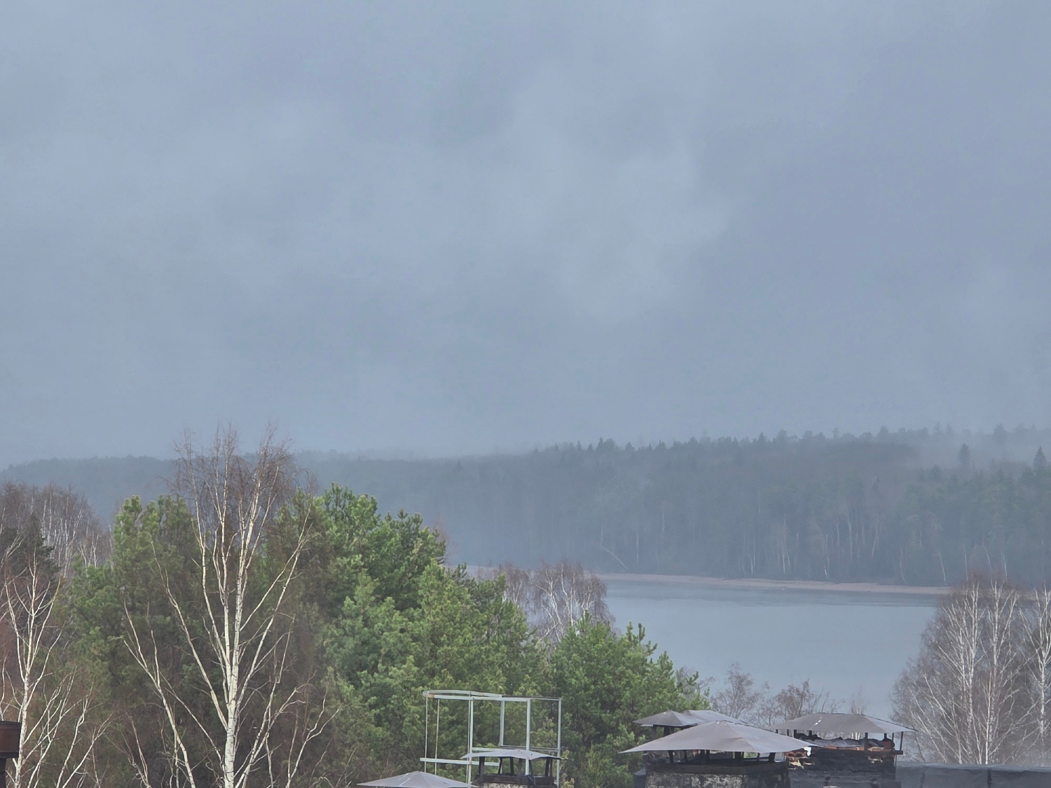 The image presents a serene, misty landscape, likely captured in Chaikovsky, Russia. The scene is dominated by a wide body of water, possibly a lake or a broad river, which stretches across the middle…read more