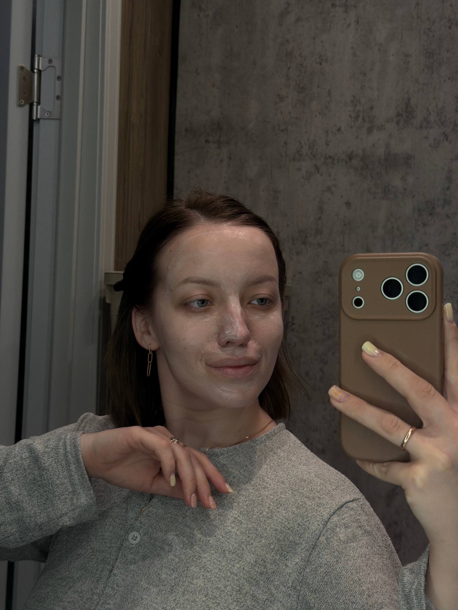 A young woman is captured taking a mirror selfie indoors, appearing to be in Reshetnikovo, Russia. She has a light-colored face mask applied to her face and looks towards the camera with a slight, cal…read more