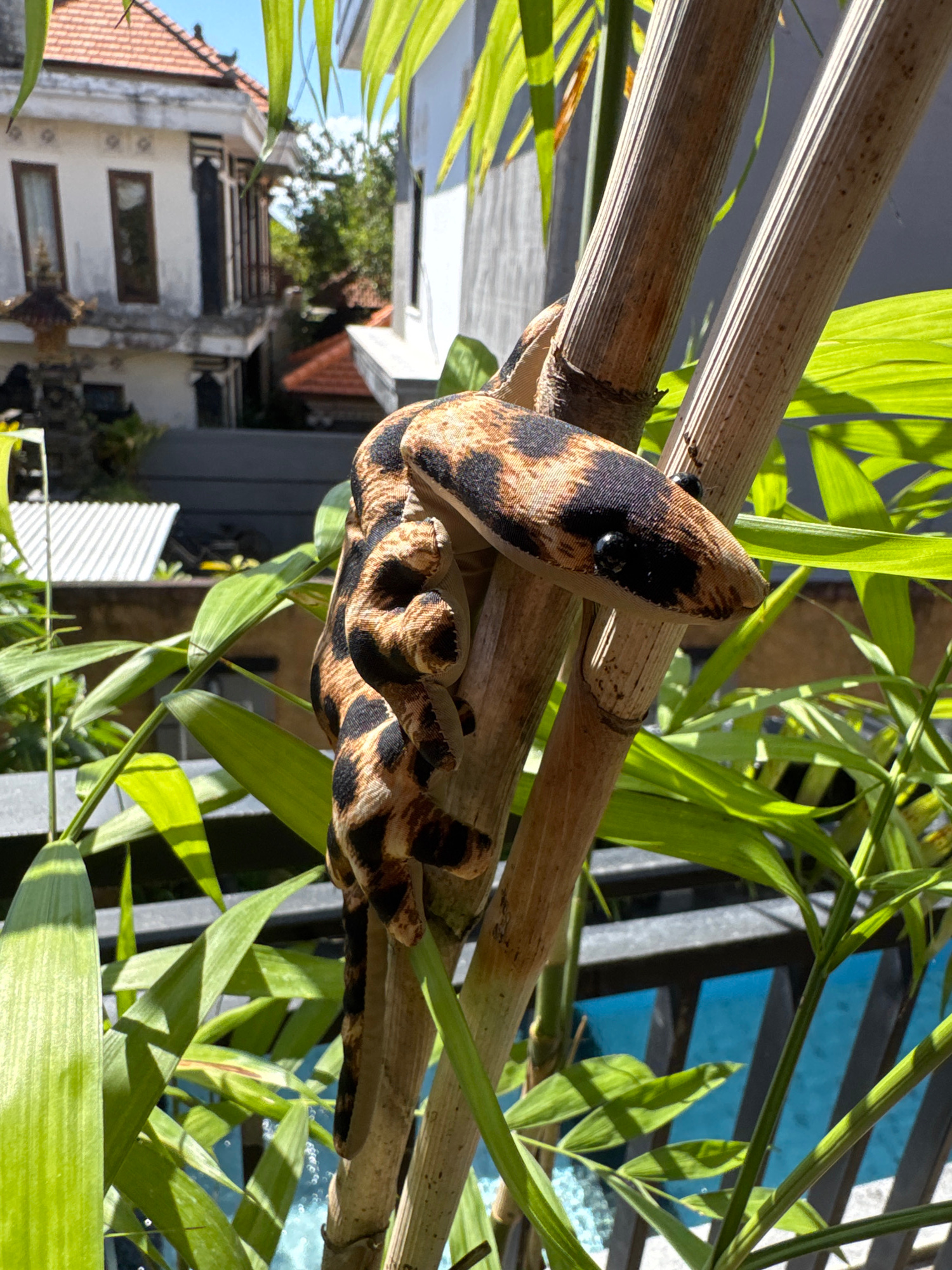 A spotted, snake-like plush toy is wound around a dried bamboo-like branch, partly obscuring a view of a building complex on a sunny day in Kuta, Indonesia. The toy is tan with dark brown spots, appea…read more