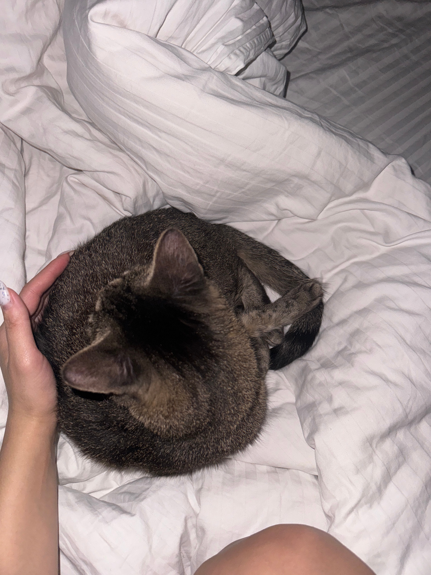 A curled-up tabby cat is resting on white bedding. A human hand is gently holding the cat. The location appears to be indoors, possibly a bedroom. No information suggests this is in Odintsovo, Russia.