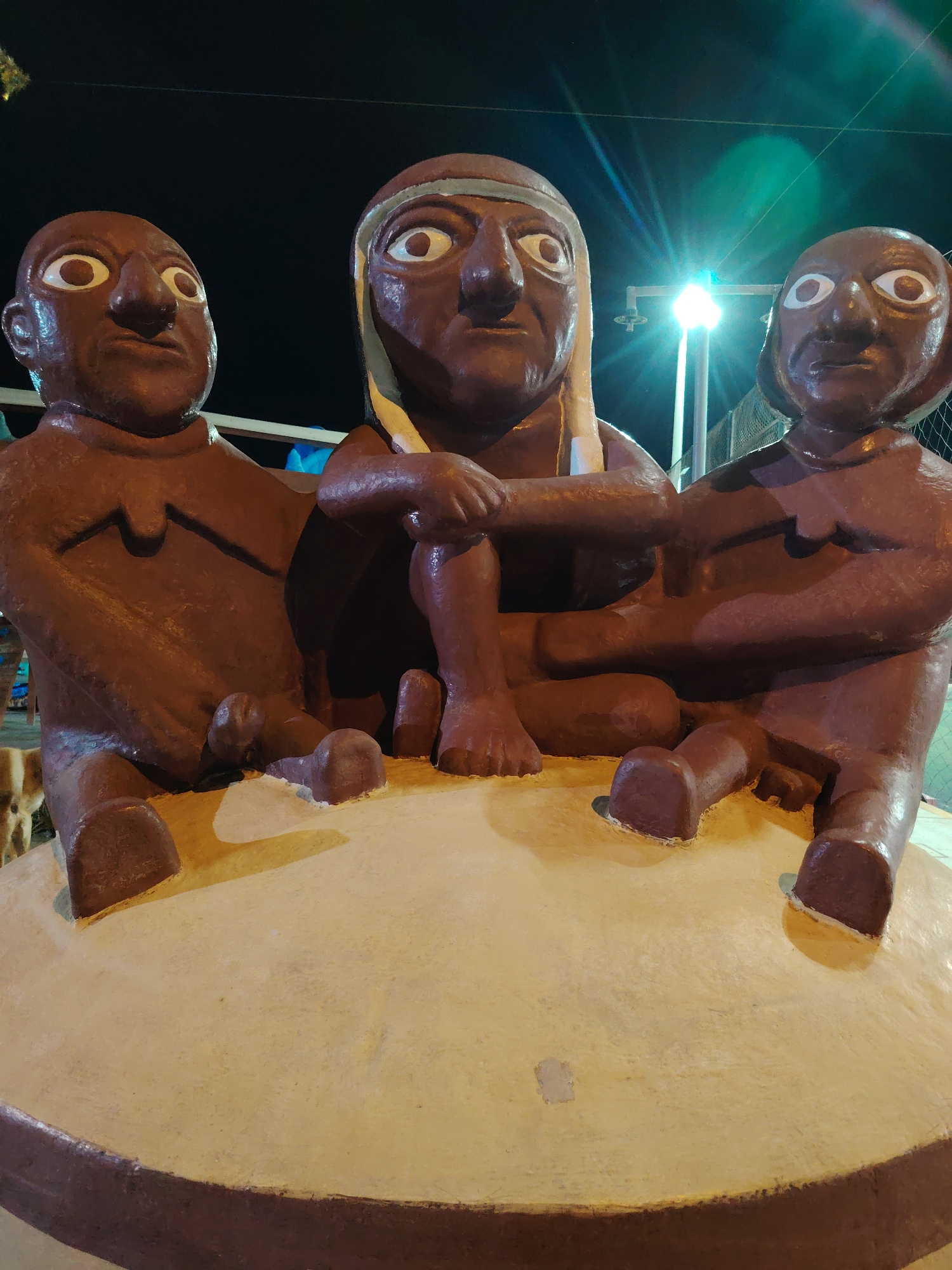 Three brown statues of Indigenous people sit on a circular, tan-colored platform. The statue in the middle wears a head wrap with a tan band. All three statues have large, white eyes. The statues appe…read more