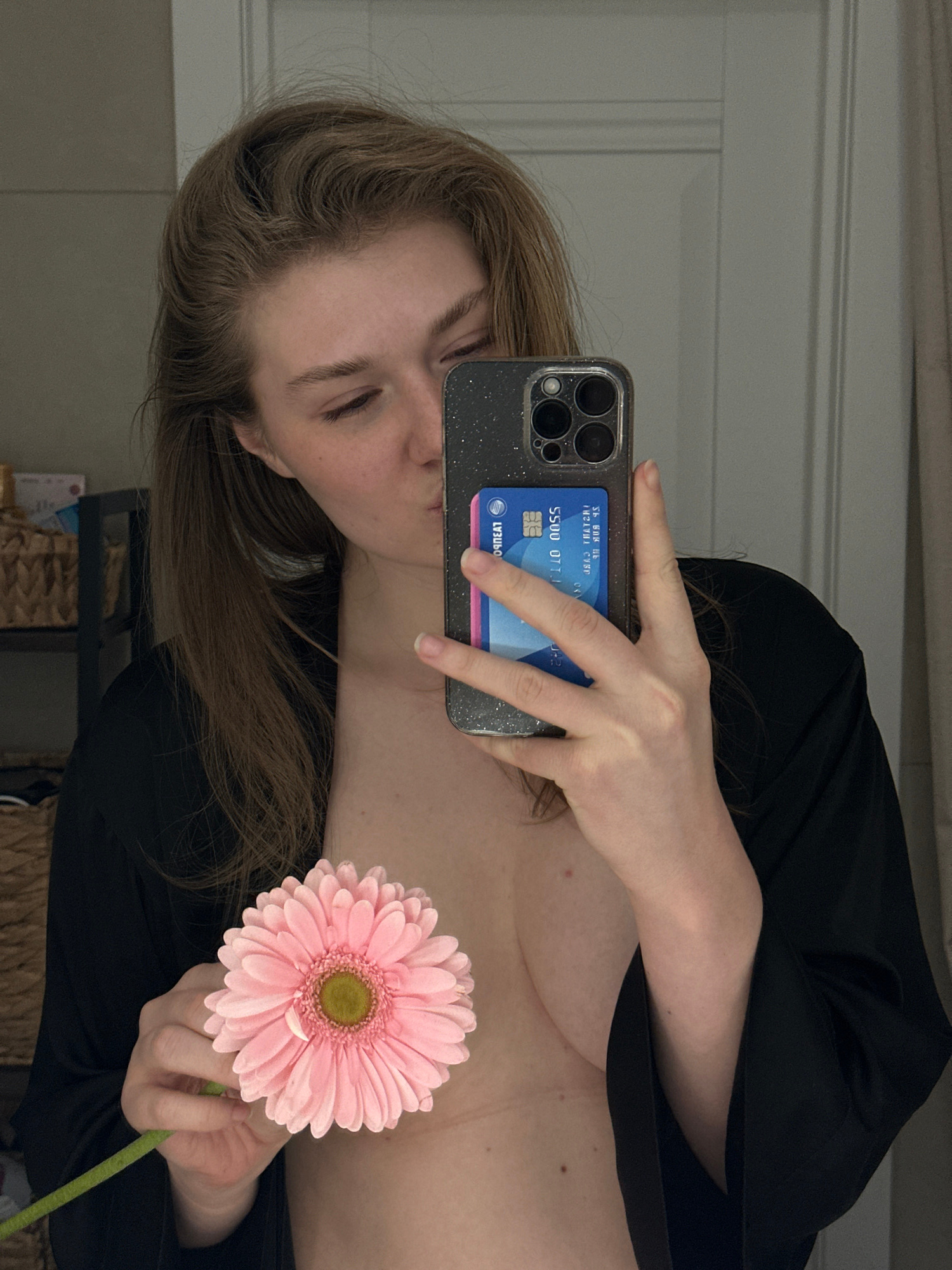 A young adult female is depicted in an indoor mirror selfie. She has long, light brown hair and is shown looking downwards and to her left, with her lips slightly puckered as if in a kiss. She is wear…read more