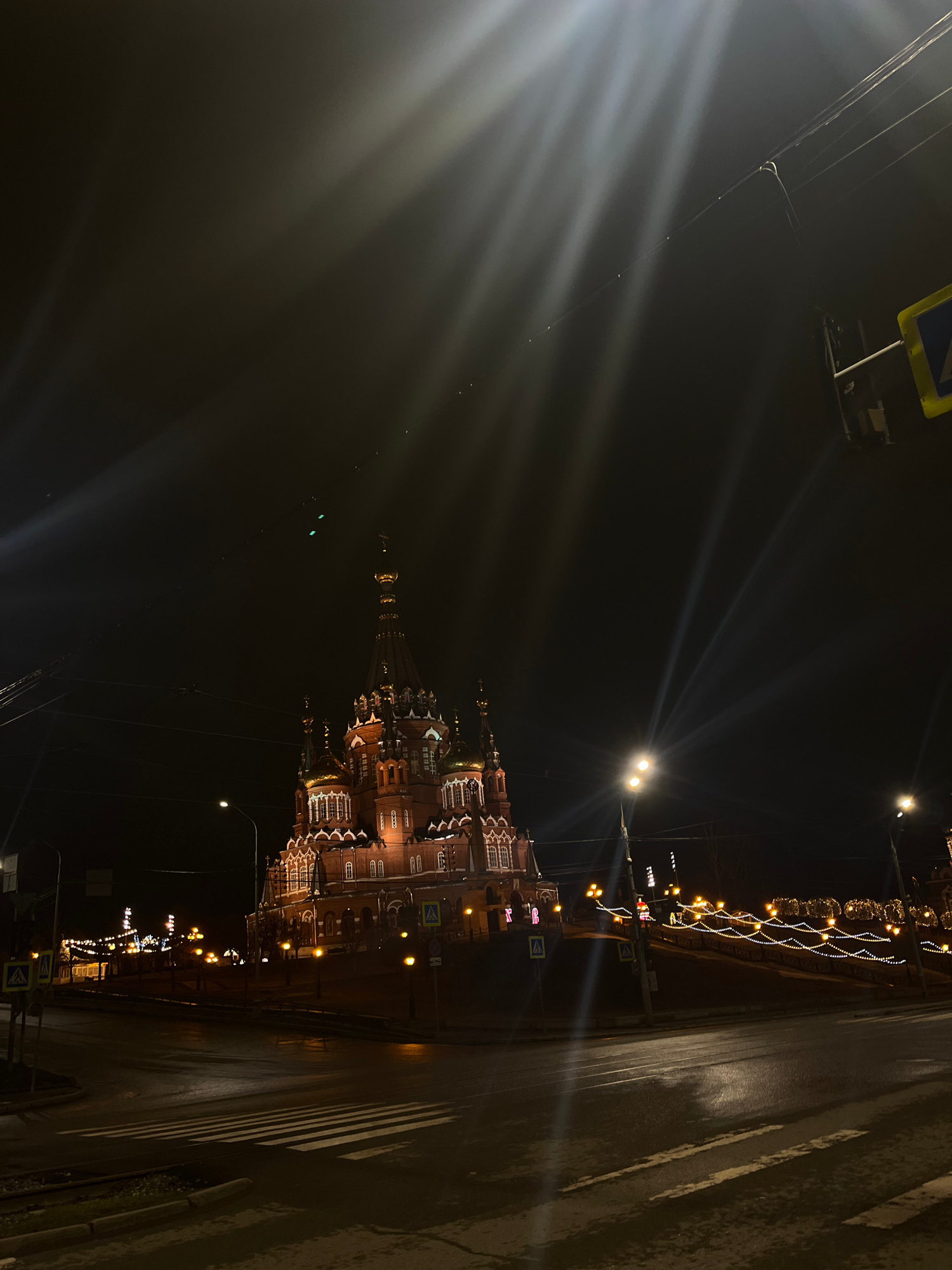 The image captures a nighttime view of the cityscape in Izhevsk, Russia, with the prominent St. Michael's Cathedral illuminated against the dark sky. The cathedral's detailed architecture is visible,…read more