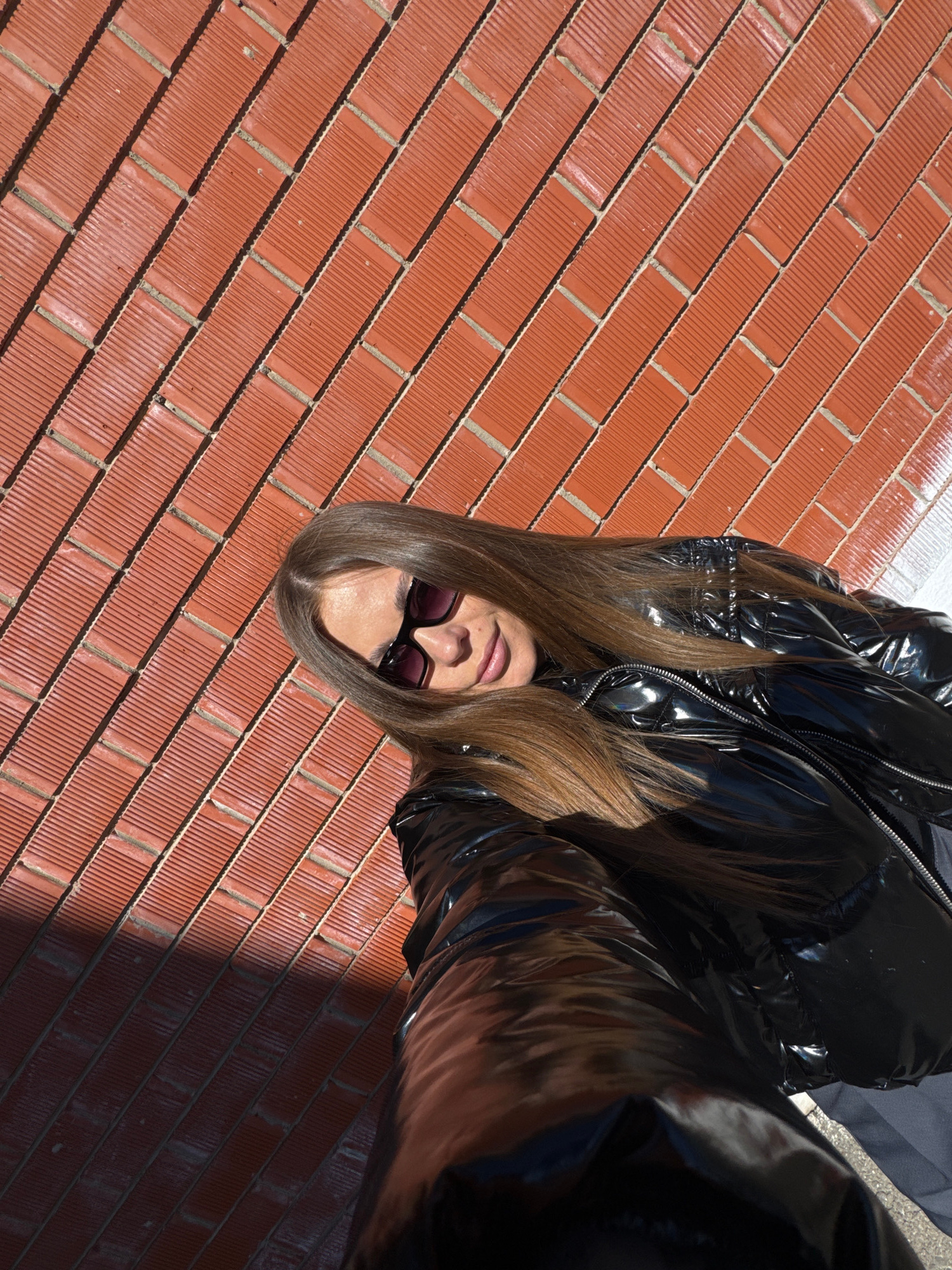 A person wearing sunglasses and a black shiny puffer jacket is positioned in front of a brick wall. The bricks are red with horizontal striations and are stacked in a diagonal pattern. Sunlight casts…read more
