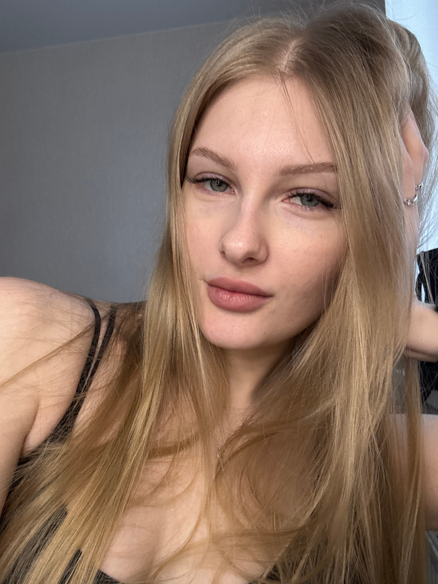 The image displays a close-up, vertically oriented portrait of a young woman, likely in her late teens or early twenties. Her head is tilted, and her long, straight to slightly wavy light blonde or as…read more