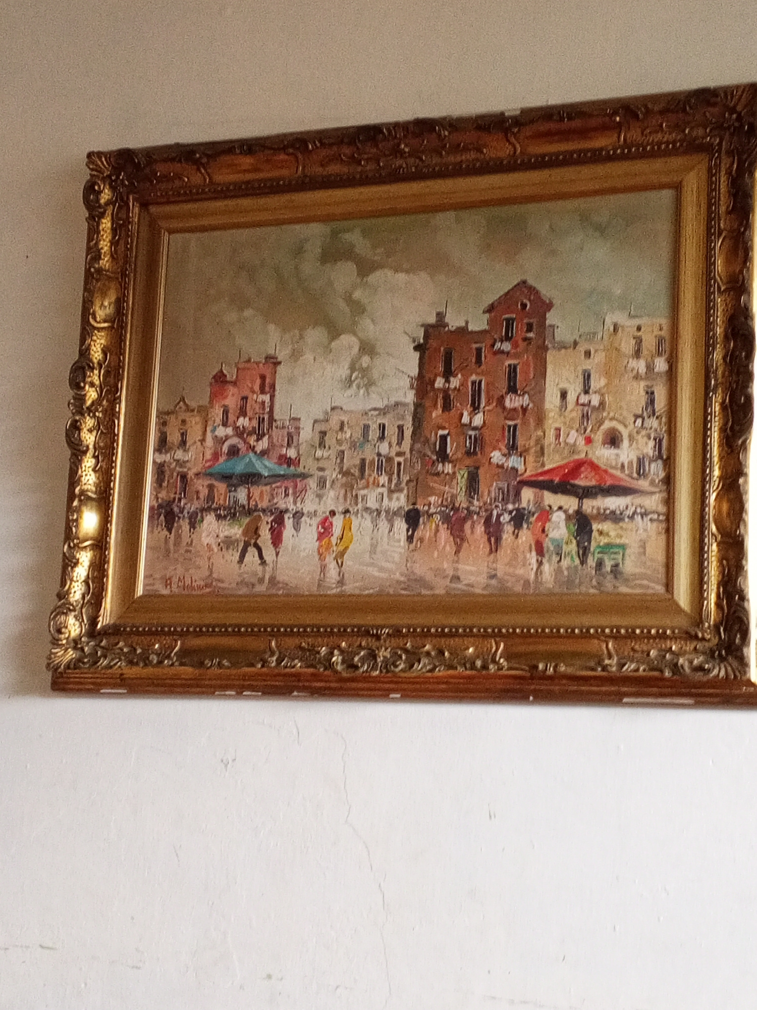 The image depicts a framed painting hanging on a white wall. The painting features a European-style cityscape, possibly a piazza, with buildings, umbrellas, and numerous people. The buildings are mult…read more