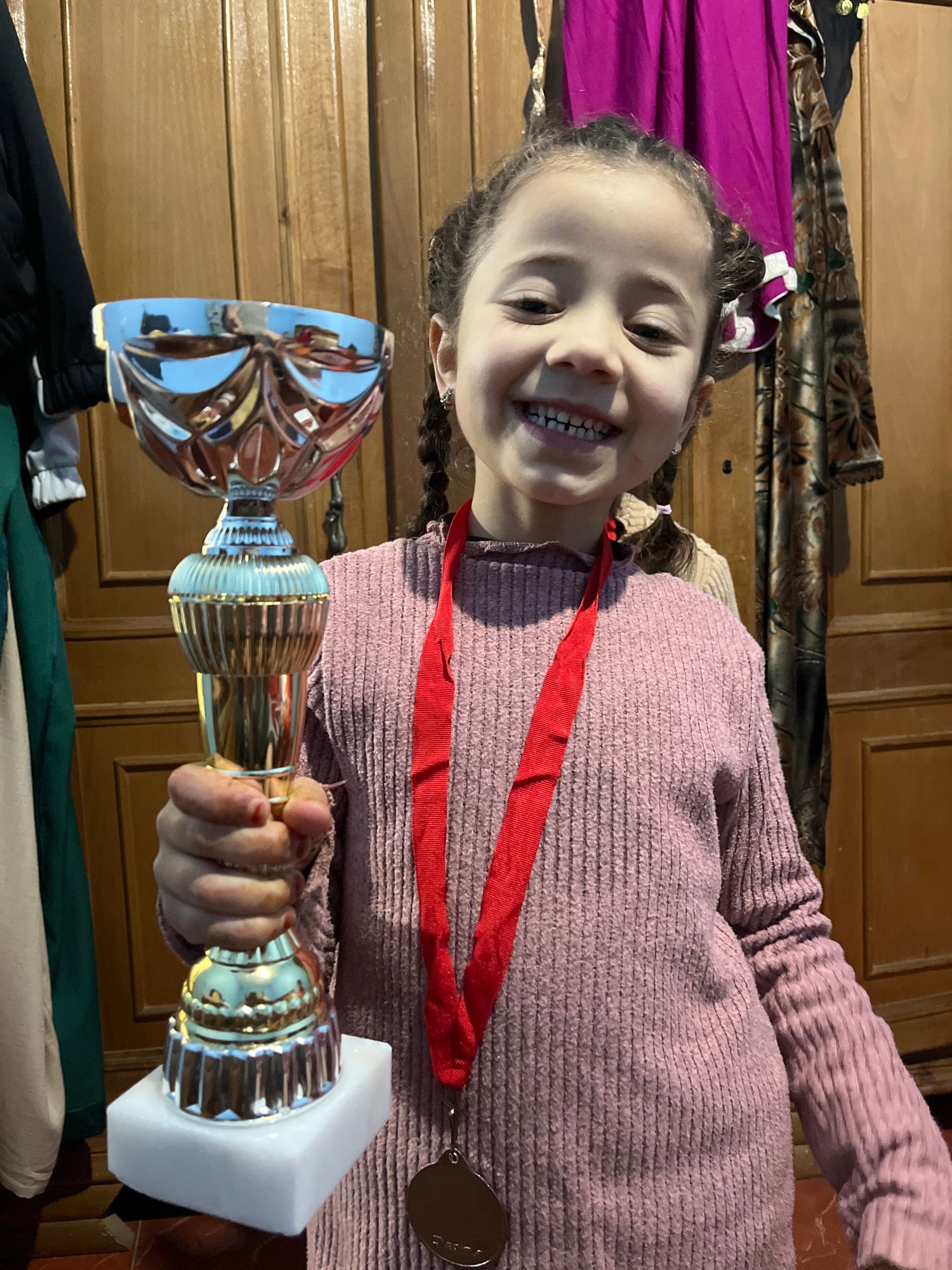 A young girl is displaying a trophy and medal, possibly in Ouaouizert, Morocco. She wears a pink ribbed long-sleeve shirt and has pigtails. A red ribbon hangs around her neck, supporting a medal. The…read more