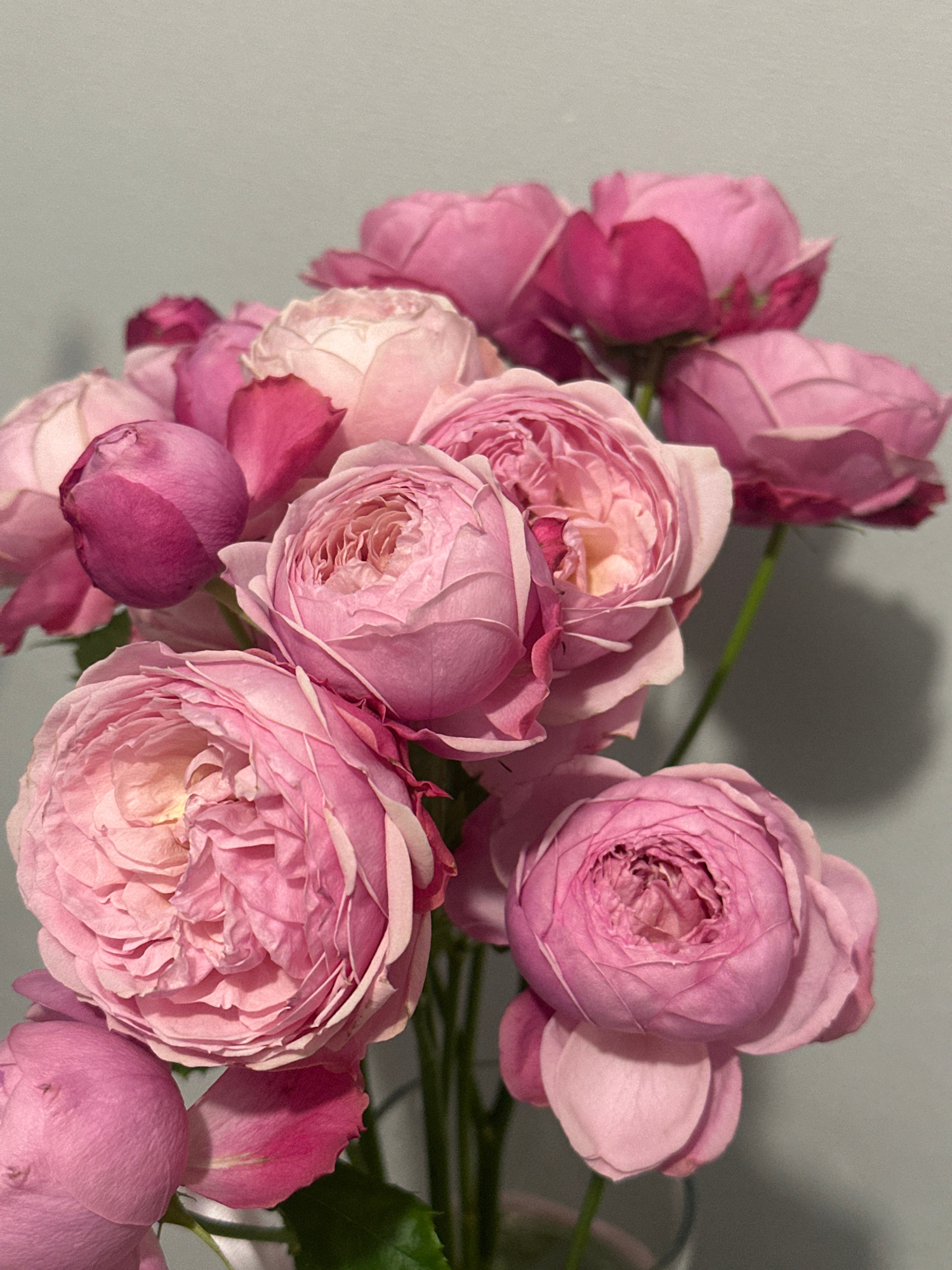 The image shows a cluster of pink roses against a light gray background. The roses are of varying sizes and shades of pink, some fully open and others still in bud. The lighting is soft, casting shado…read more