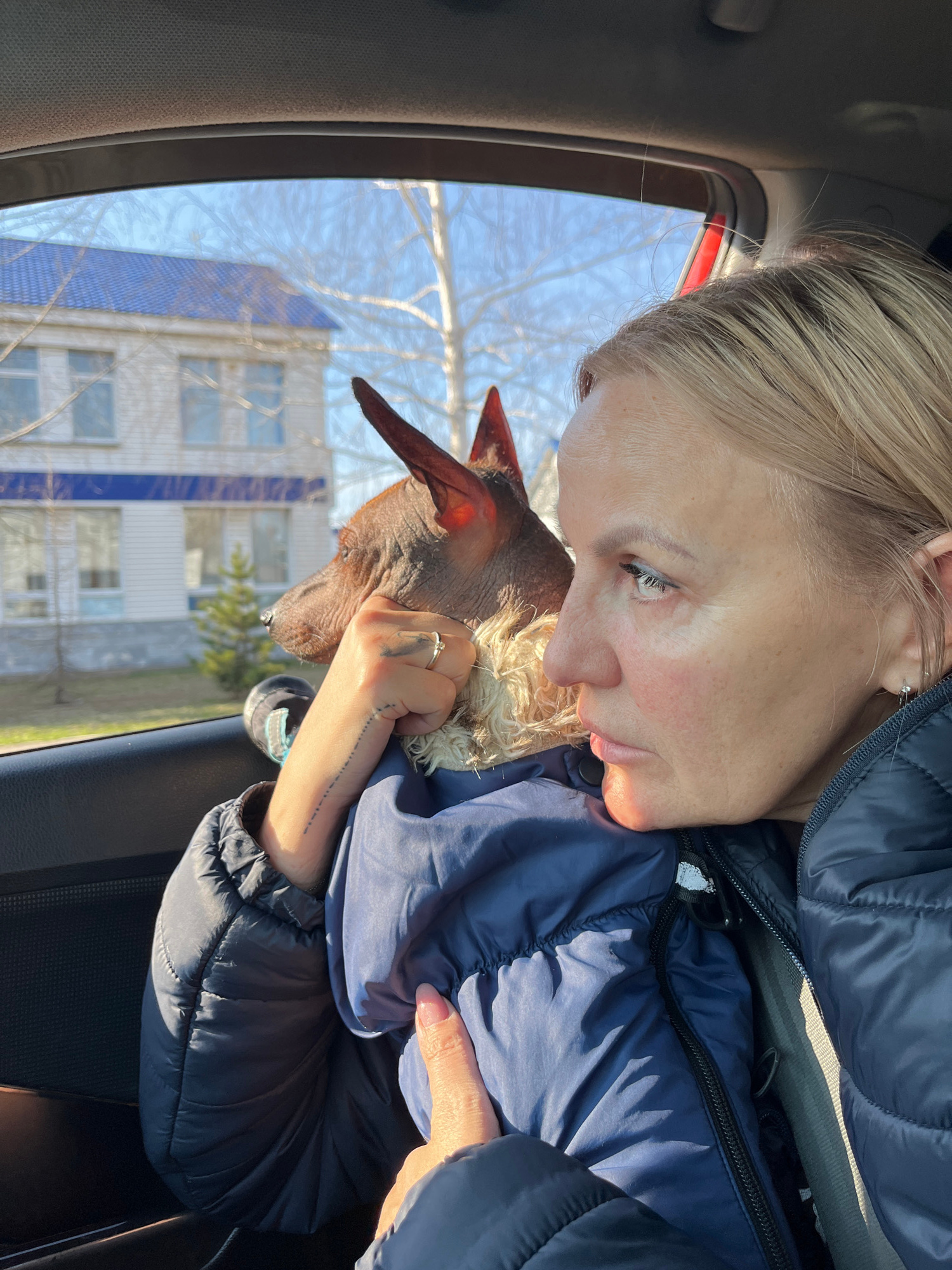 A blonde woman is holding a brown Doberman Pinscher dog in her arms while sitting in a car. The woman is fair-skinned with short, light blonde hair and is wearing a dark blue, quilted jacket. She is l…read more