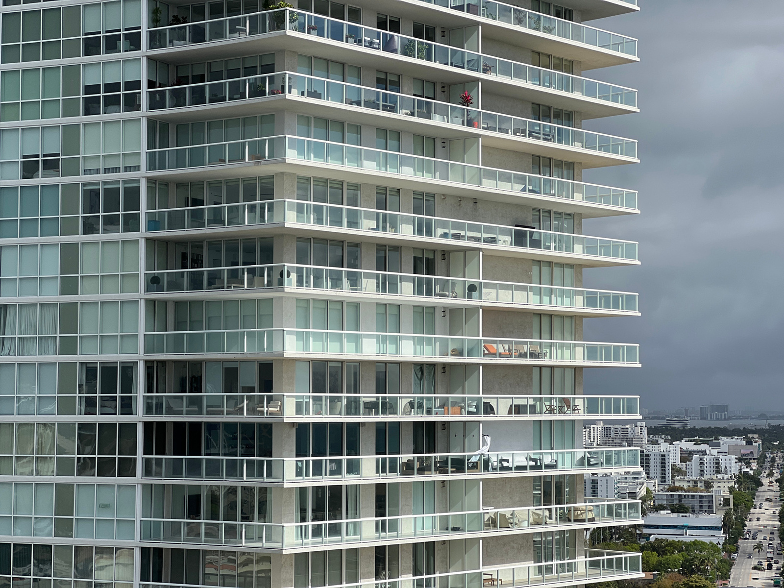 The image shows a modern, high-rise condominium building in Miami Beach, Florida, USA. The building's architecture features multiple floors with projecting balconies enclosed by glass railings. Each fâŚread more