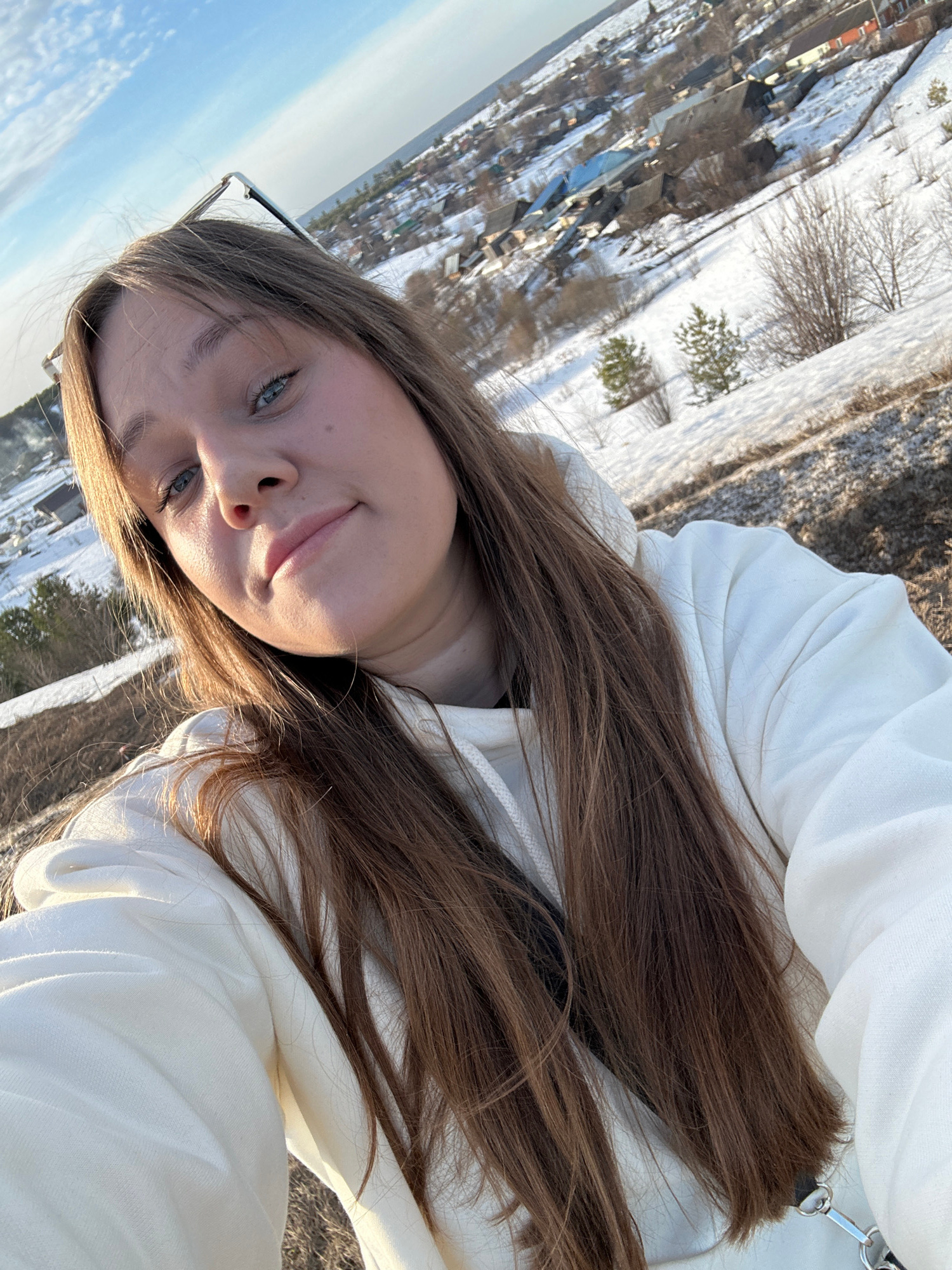 A female subject is depicted in a close-up selfie photograph, taken outdoors in the city of Фоки, Russia. She has long, straight brown hair, blue eyes, and a fair complexion, and is looking directly a…read more