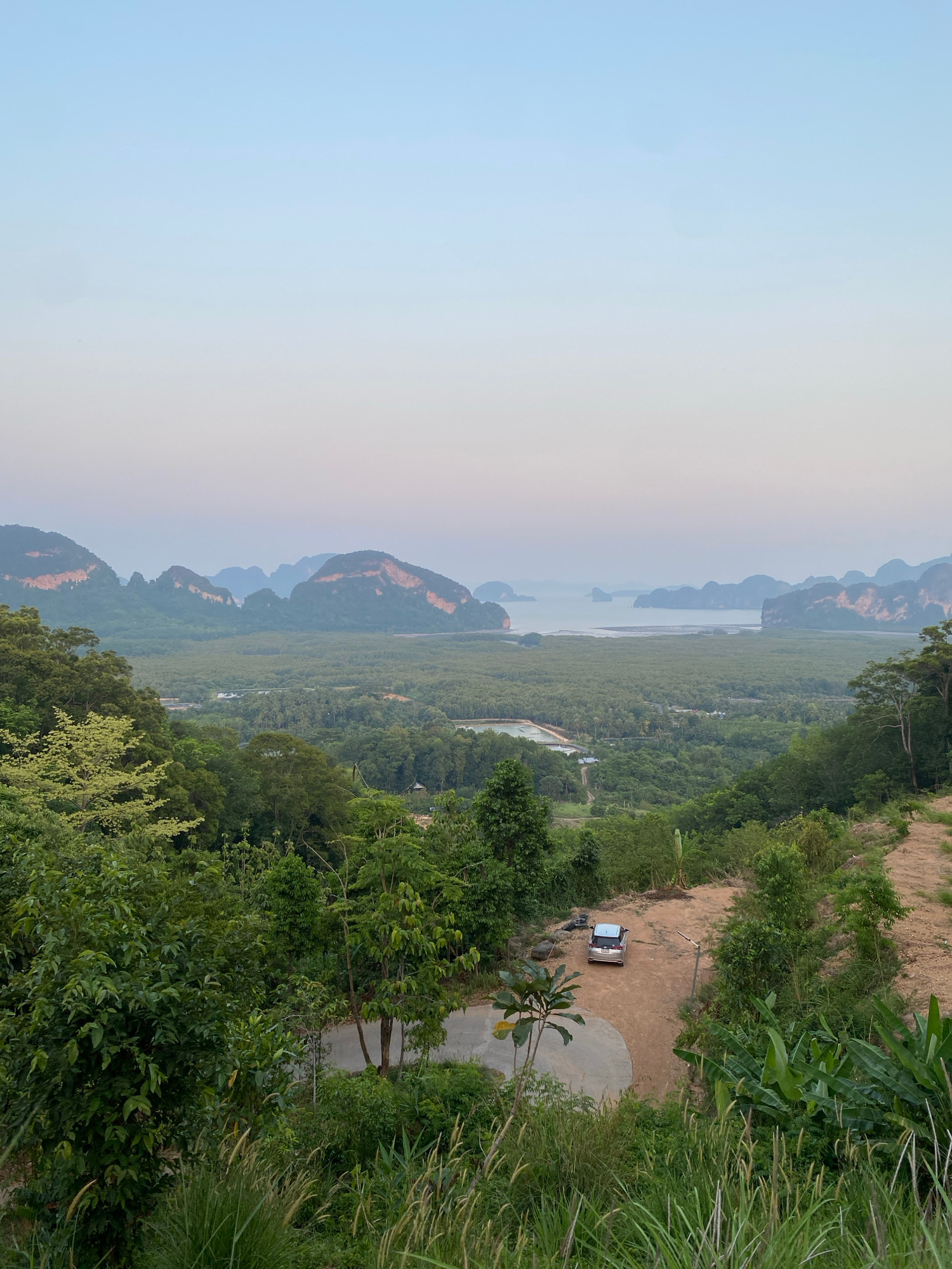 A high-angle landscape view reveals an expansive vista of Khlong Khian, Thailand, featuring a backdrop of distant islands and a foreground of lush greenery. A road curves into the right foreground, ad…read more