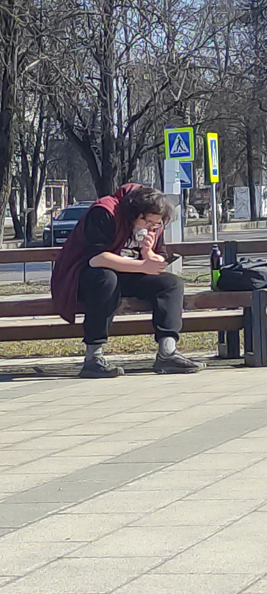 A person is sitting on a bench in what appears to be an urban environment. The person is wearing dark clothing and a burgundy hooded garment. They are holding a small white object close to their face.…read more