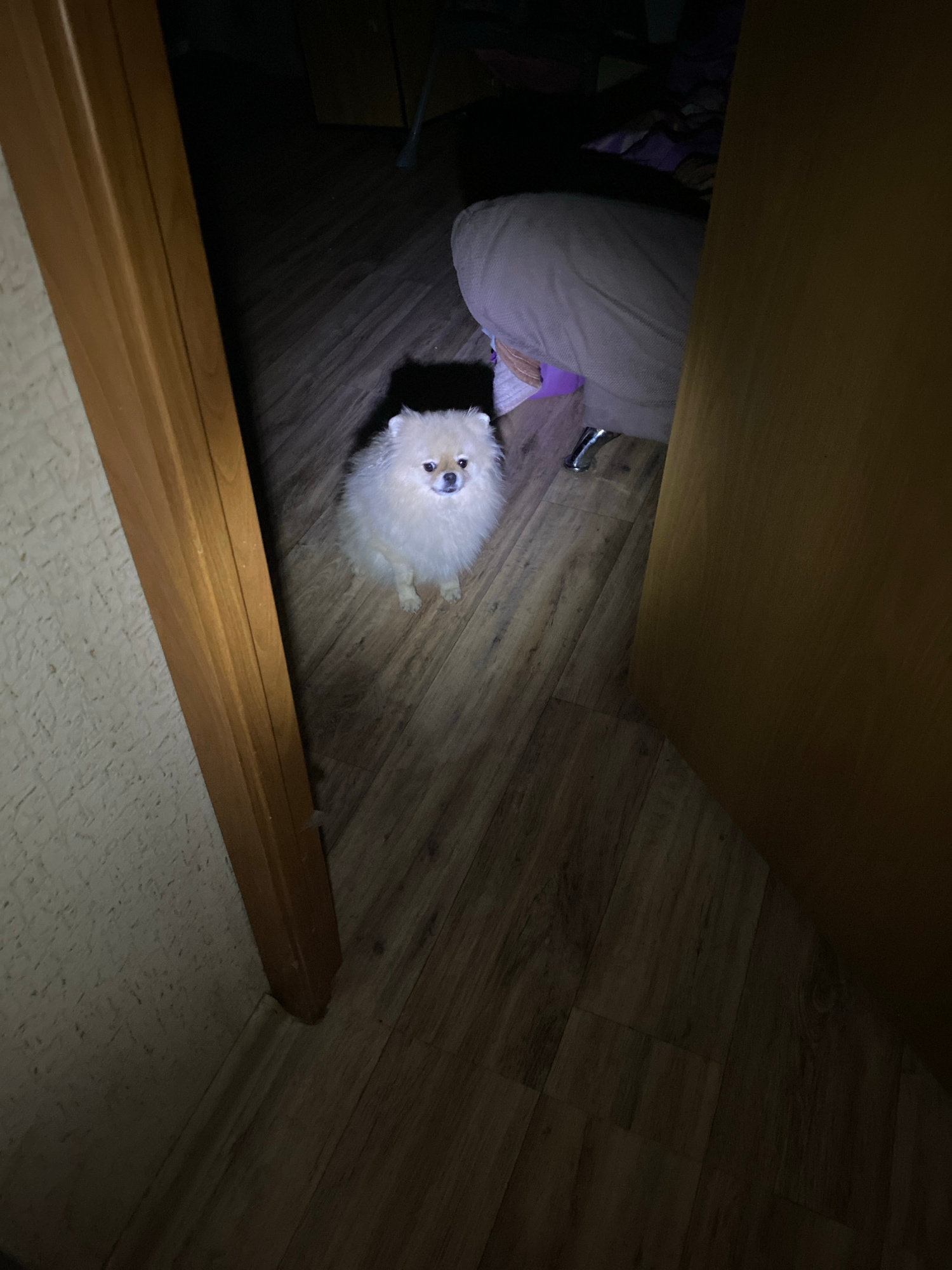 A fluffy, white Pomeranian dog is standing on dark wood-patterned flooring. The dog is positioned partially under a wooden structure, possibly a piece of furniture. To the left of the dog is a chair oβ¦read more