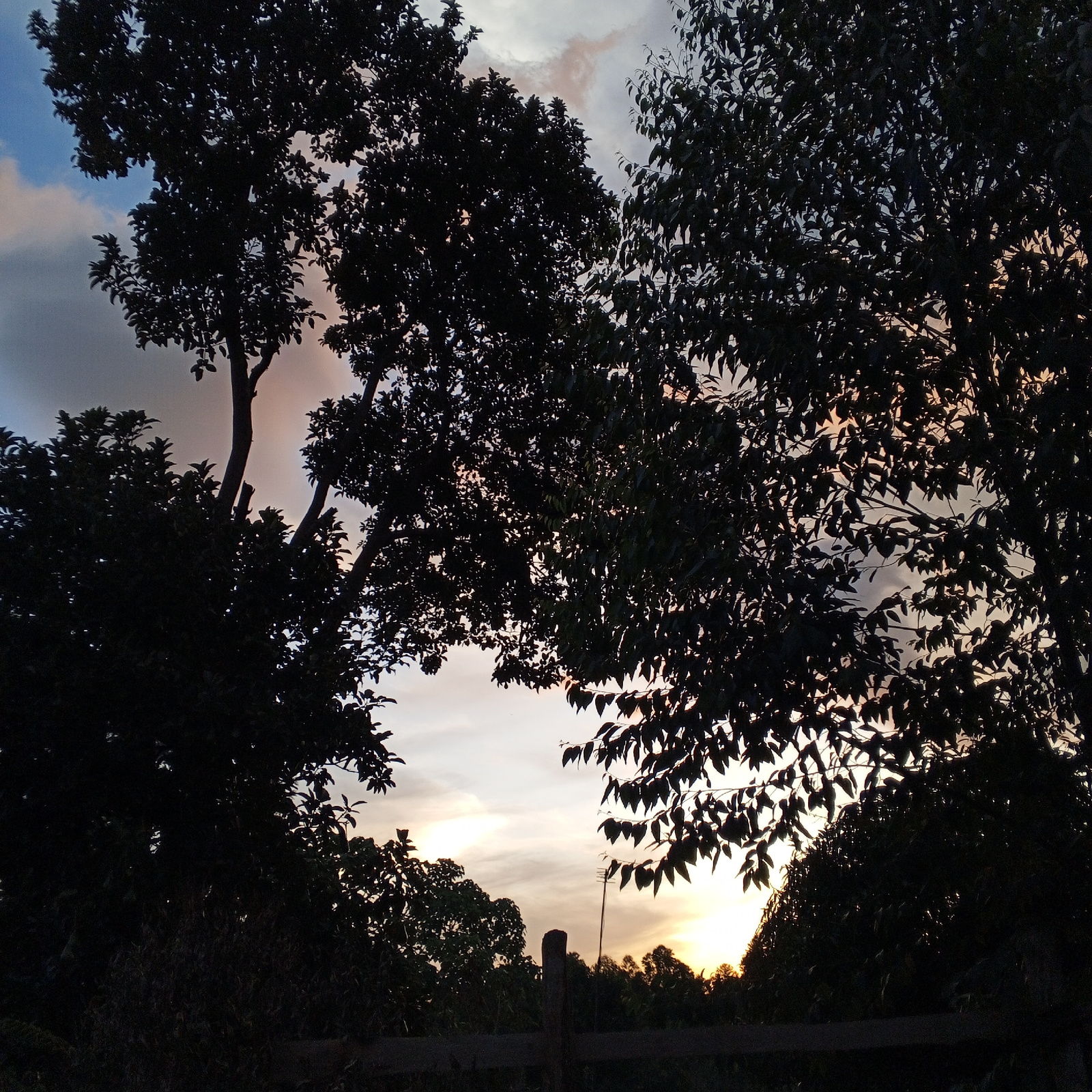 The image, taken in Getenga ward, Kenya, shows a landscape at dusk or dawn. Silhouetted trees frame a sky with hints of blue, grey, pink, and orange. In the foreground, vegetation is also silhouetted,…read more