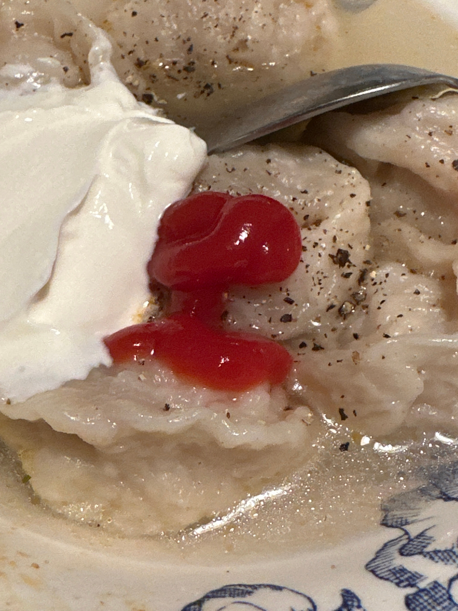 A close-up shot reveals a bowl of pierogi, garnished with black pepper, a dollop of sour cream, and two small portions of a red sauce, possibly ketchup. A spoon is partially visible on the left side o…read more