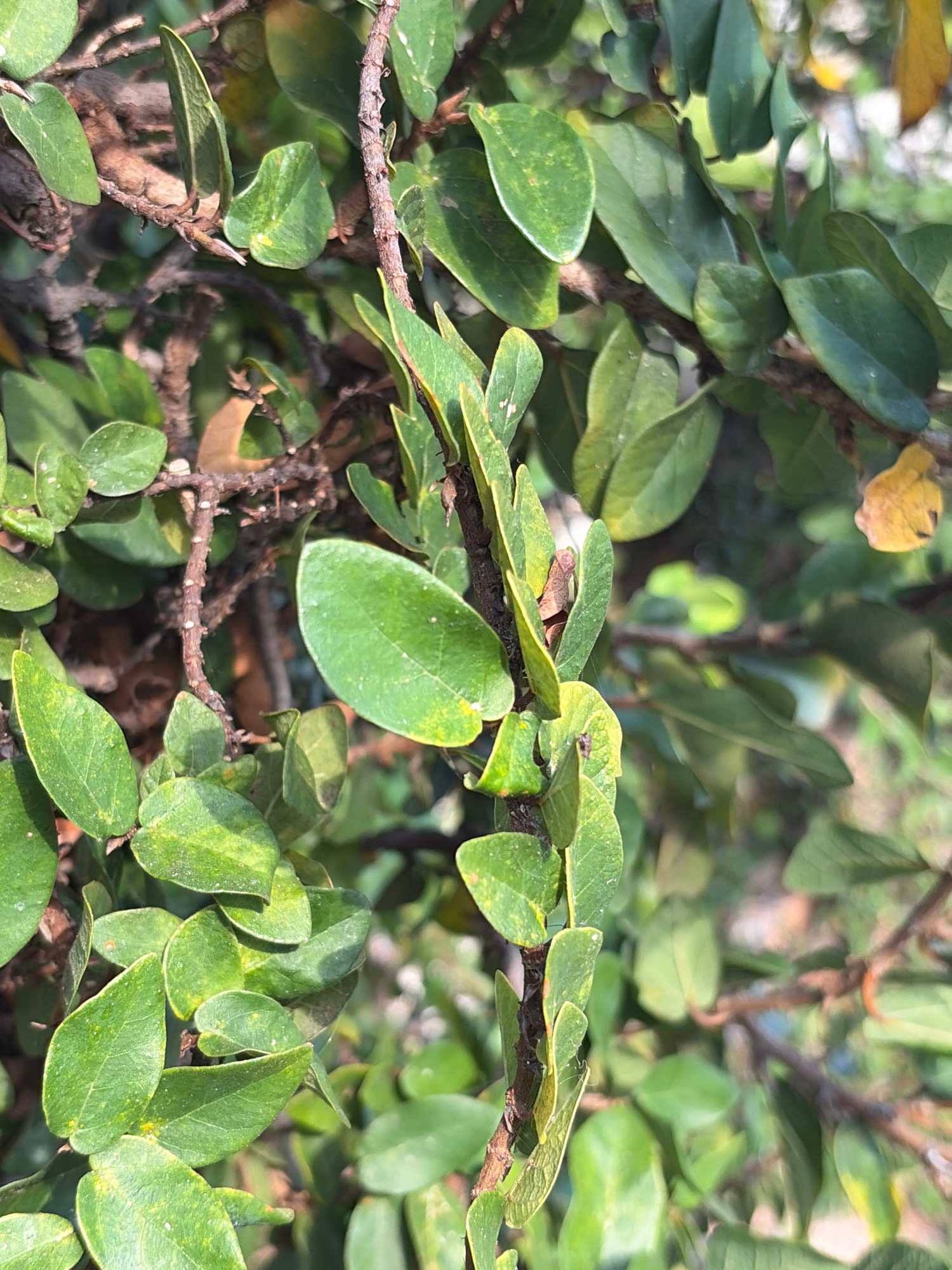 The image shows a close-up of a creeping fig vine with small, rounded green leaves growing along a woody stem. The environment is likely outdoors, given the natural foliage and lighting. There is no i…read more